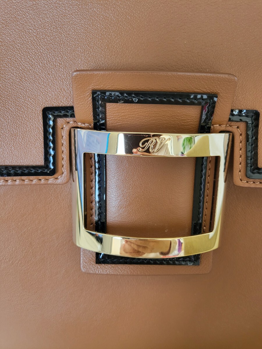 カラー:ベージュ、ブラウン(カーフ)、ハンドル、ショルダー部分→黒のエナメル、金具ゴールド