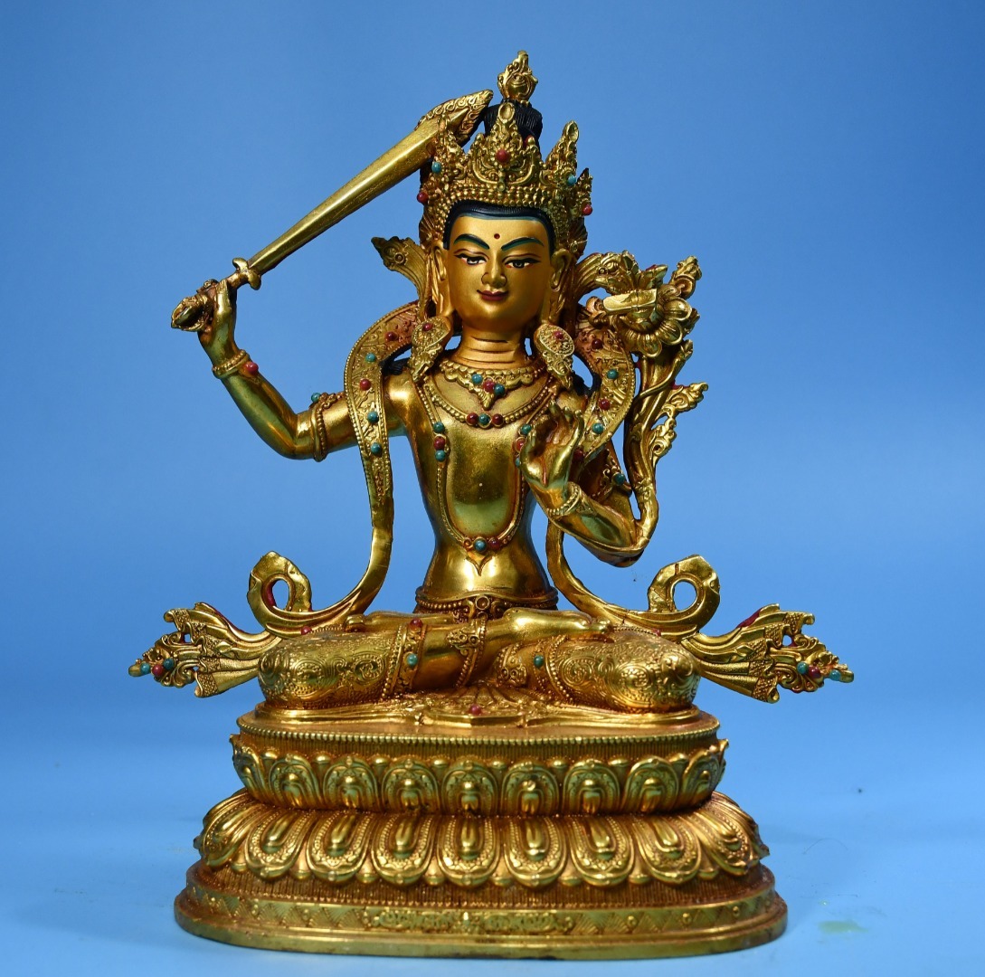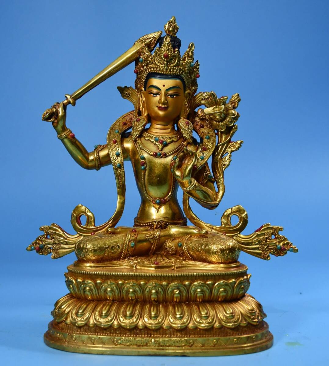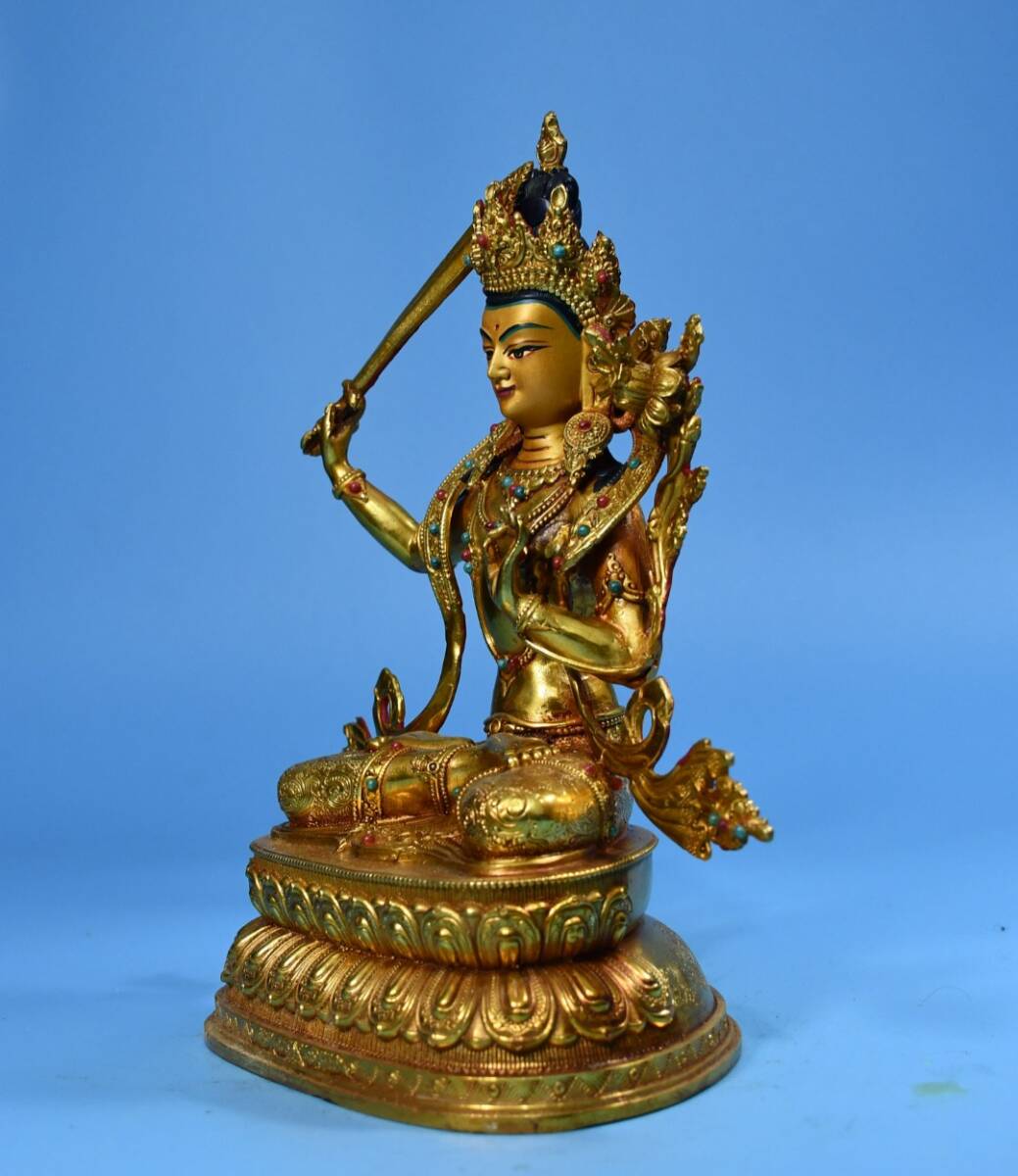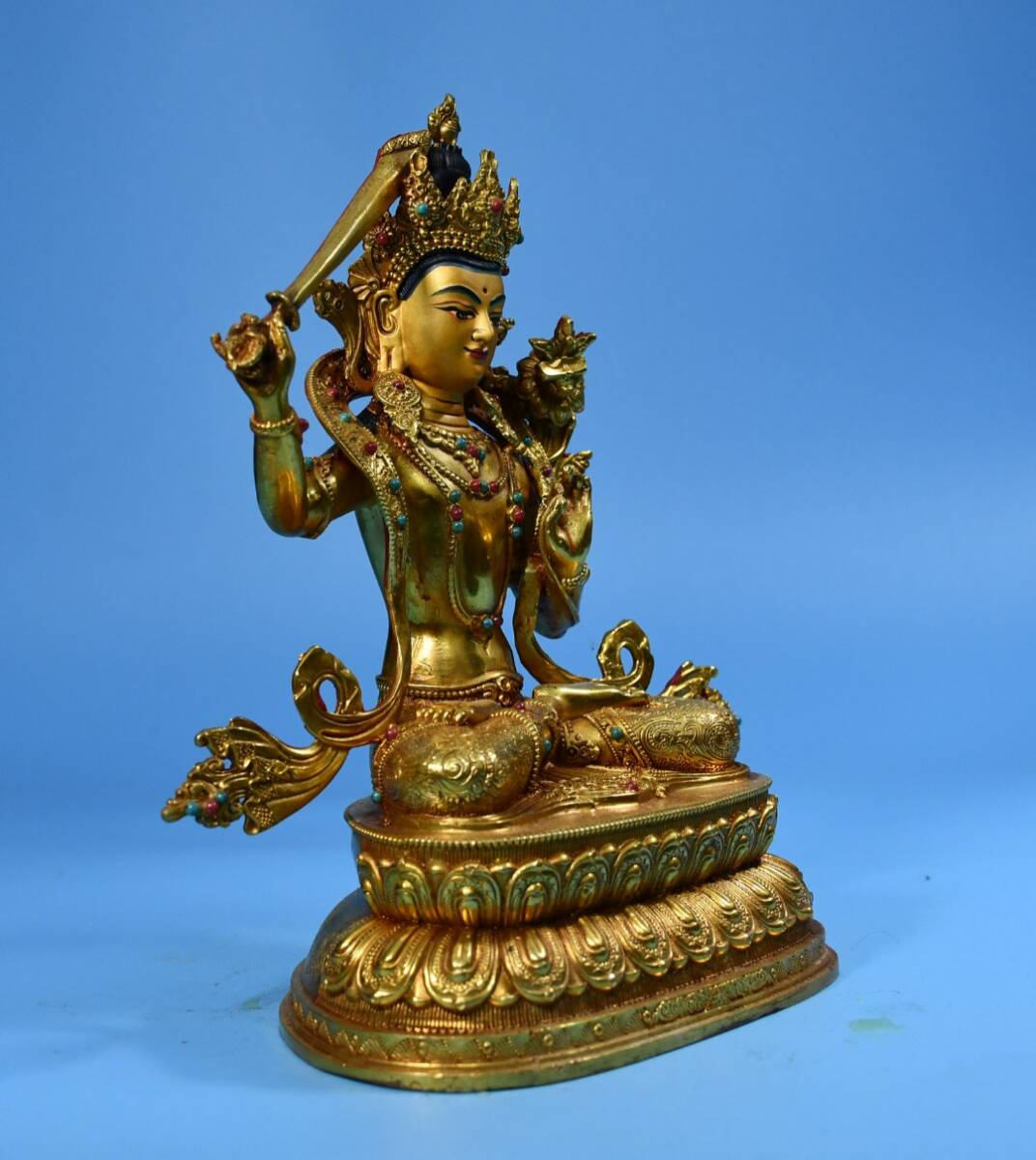 *珍品旧蔵* 大明 永樂年製 黄銅塗金 高浮彫 持劍文殊度母觀音 仏像 奉納されていた 供養品 極細工 中国古玩 仏教古美術 古美味 骨董品 H46