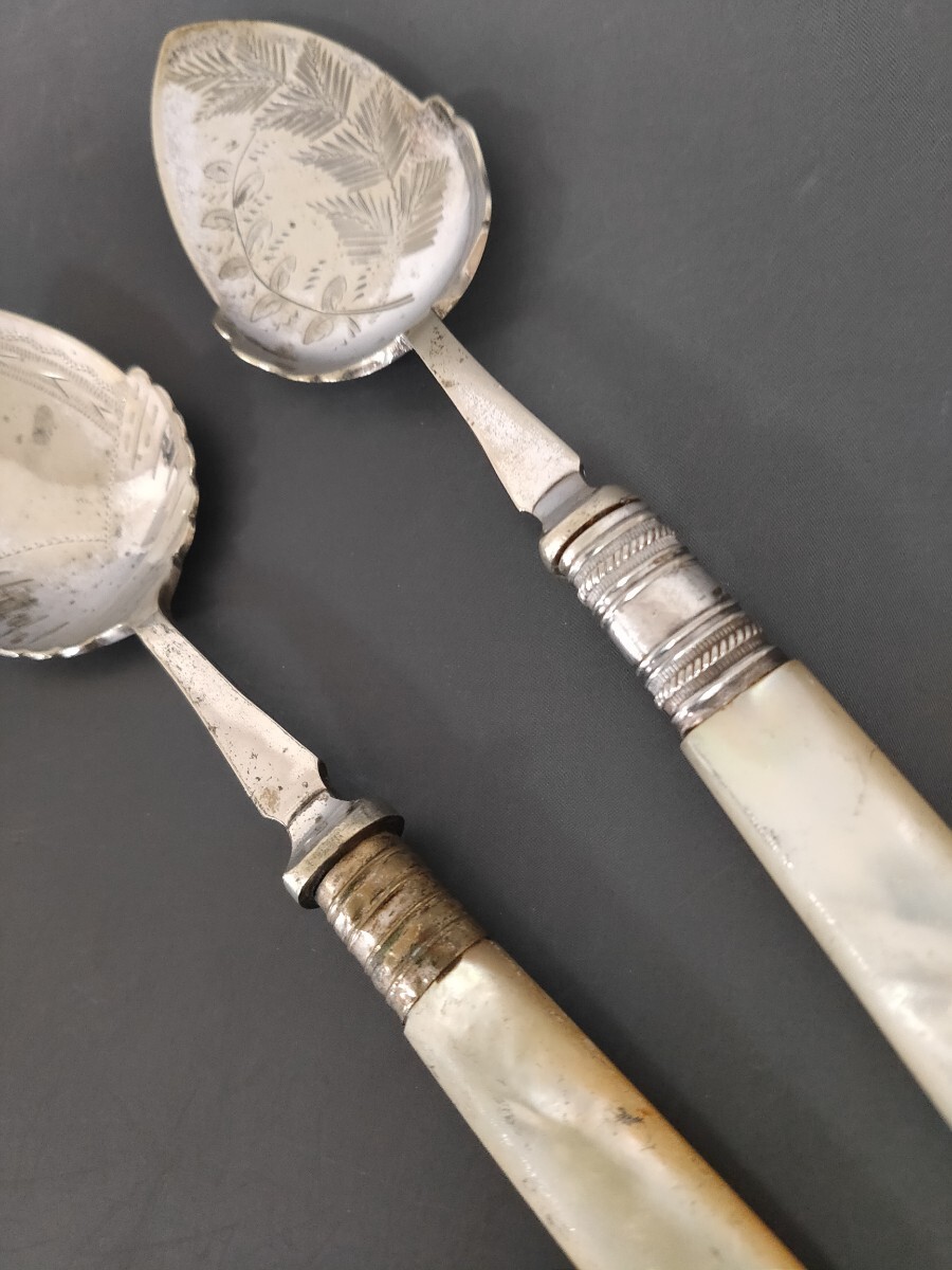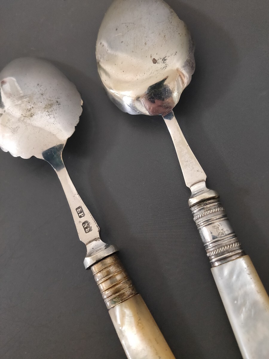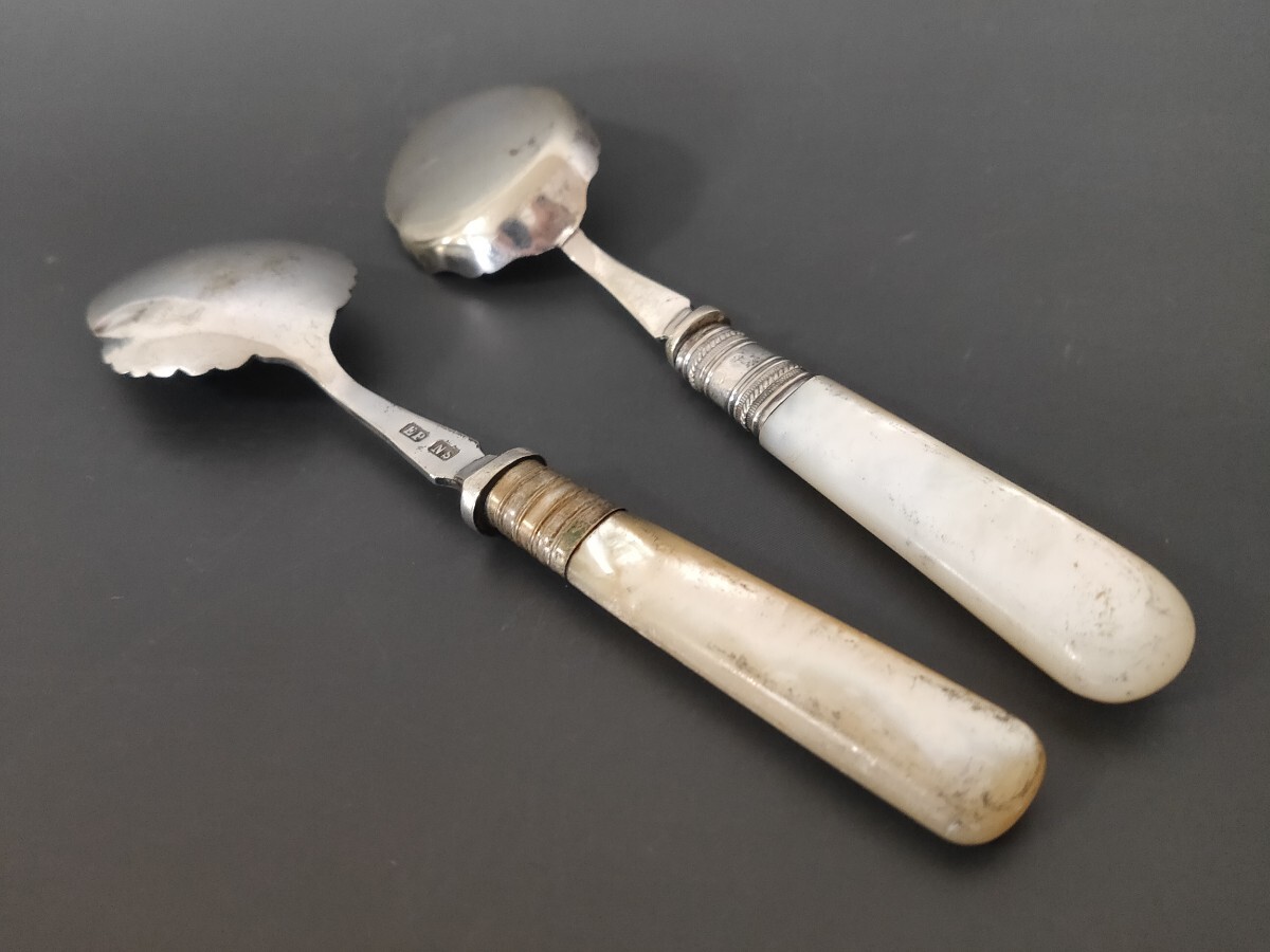 ★☆超希少★☆ 英国製 アンティーク 純銀P シルバープレート スプーン 2本set 白蝶貝ハンドル ヴィンテージ カトラリー (L11)