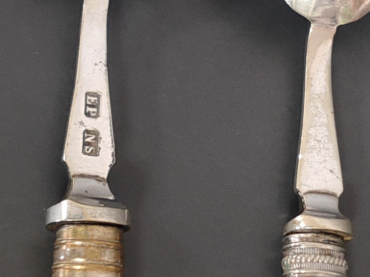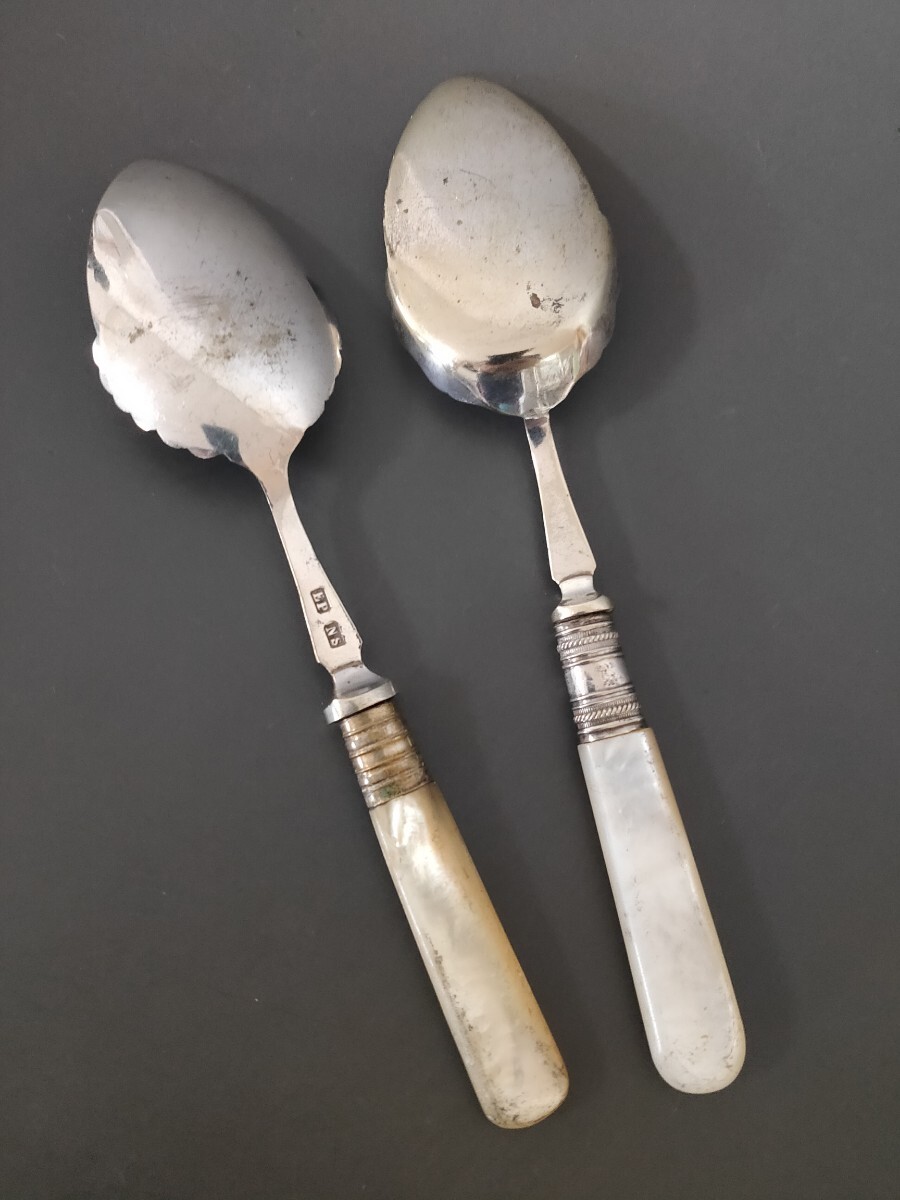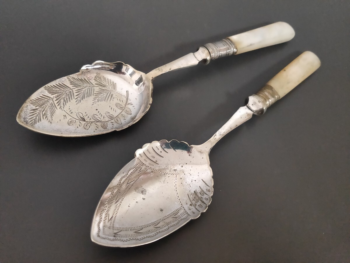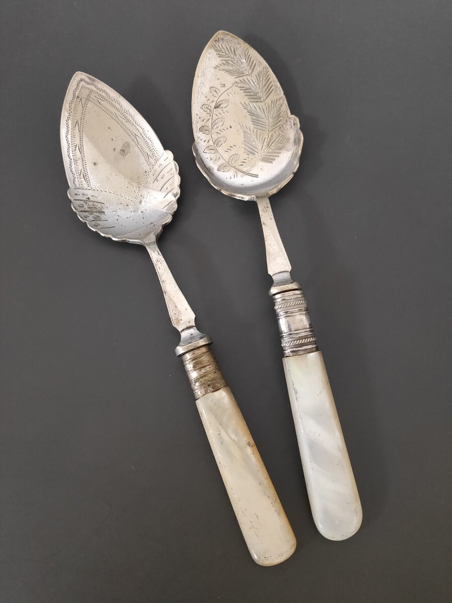 ★☆超希少★☆ 英国製 アンティーク 純銀P シルバープレート スプーン 2本set 白蝶貝ハンドル ヴィンテージ カトラリー (L11)