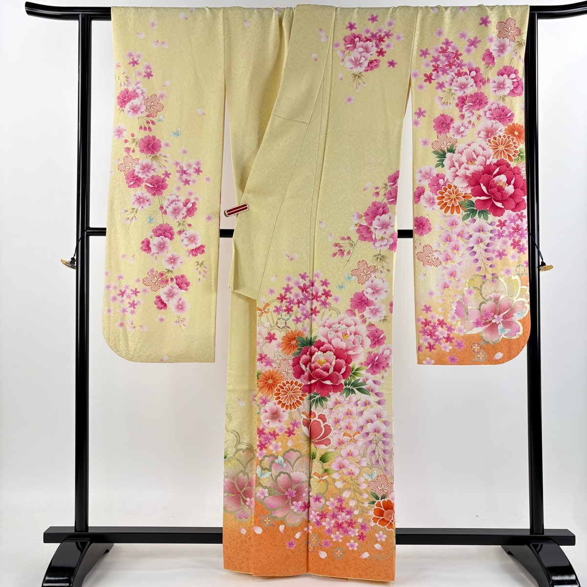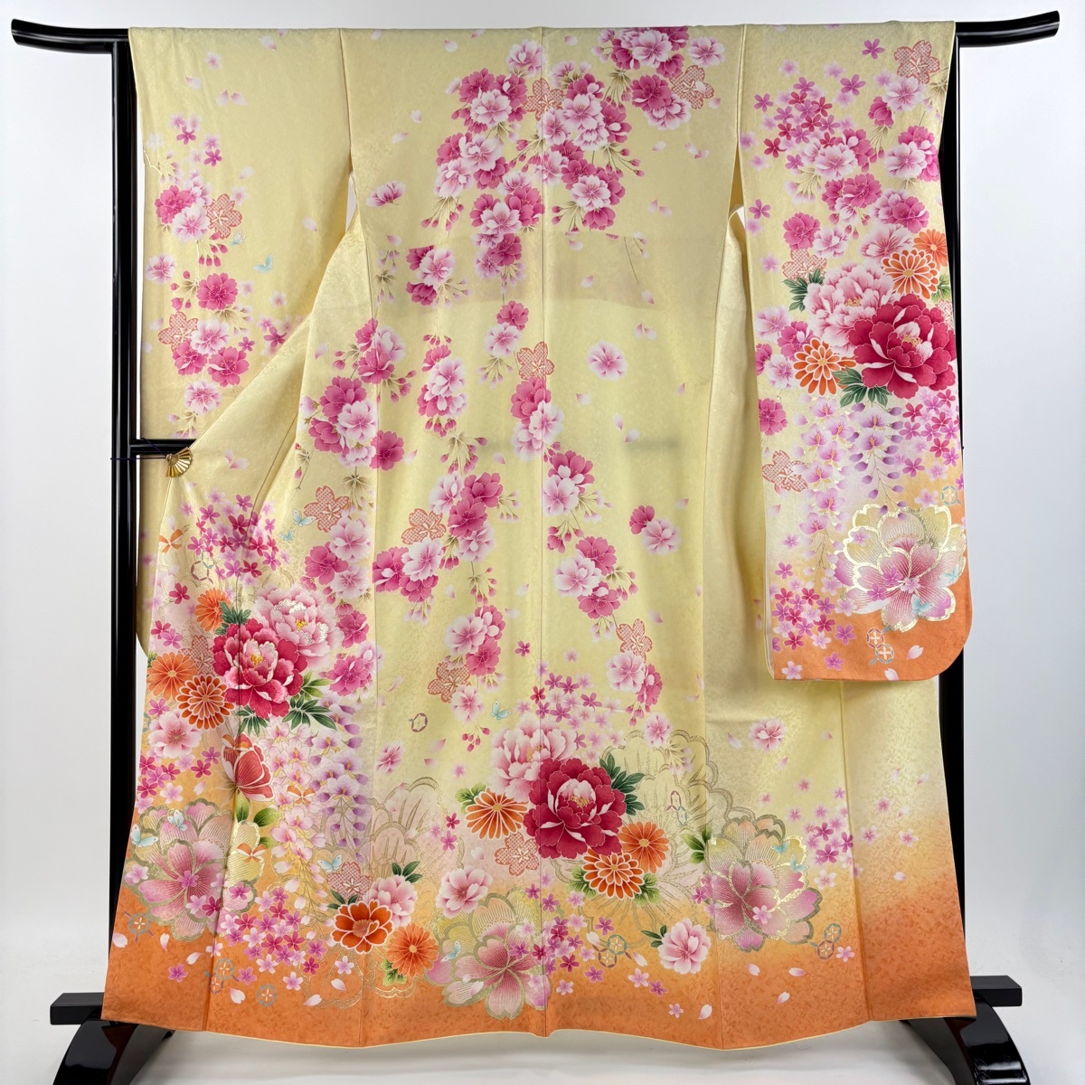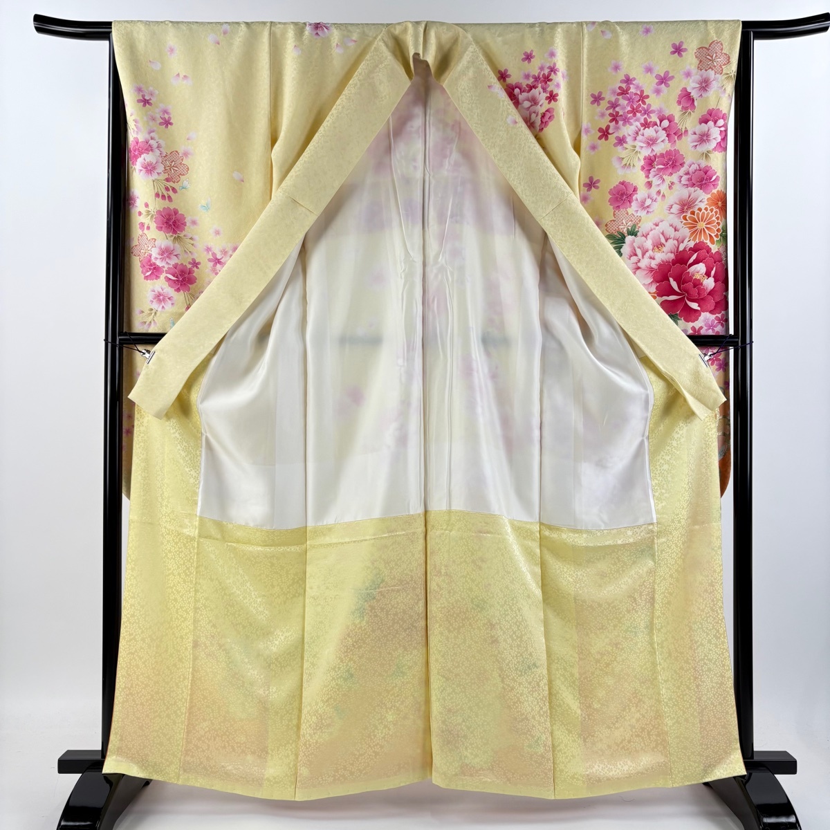振袖 美品 逸品 牡丹 蝶 銀通し 刺繍 薄黄 袷 身丈162 裄丈65 M 正絹 【中古】 |