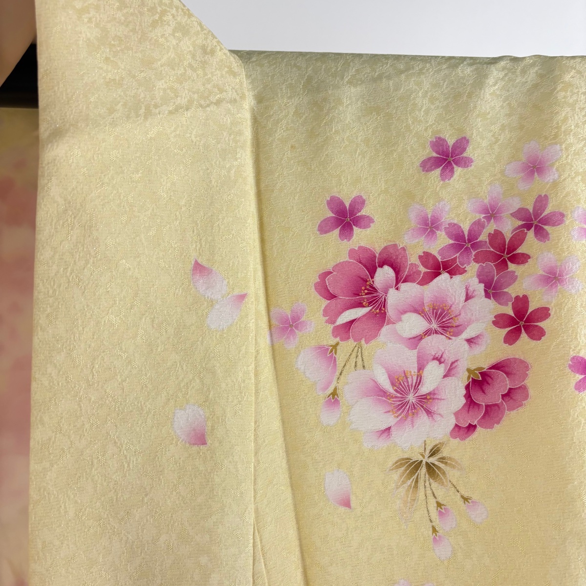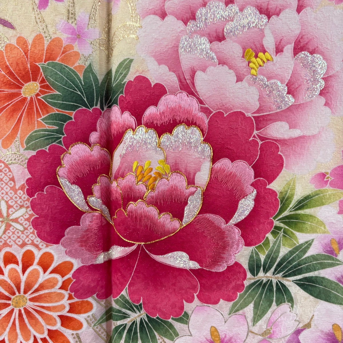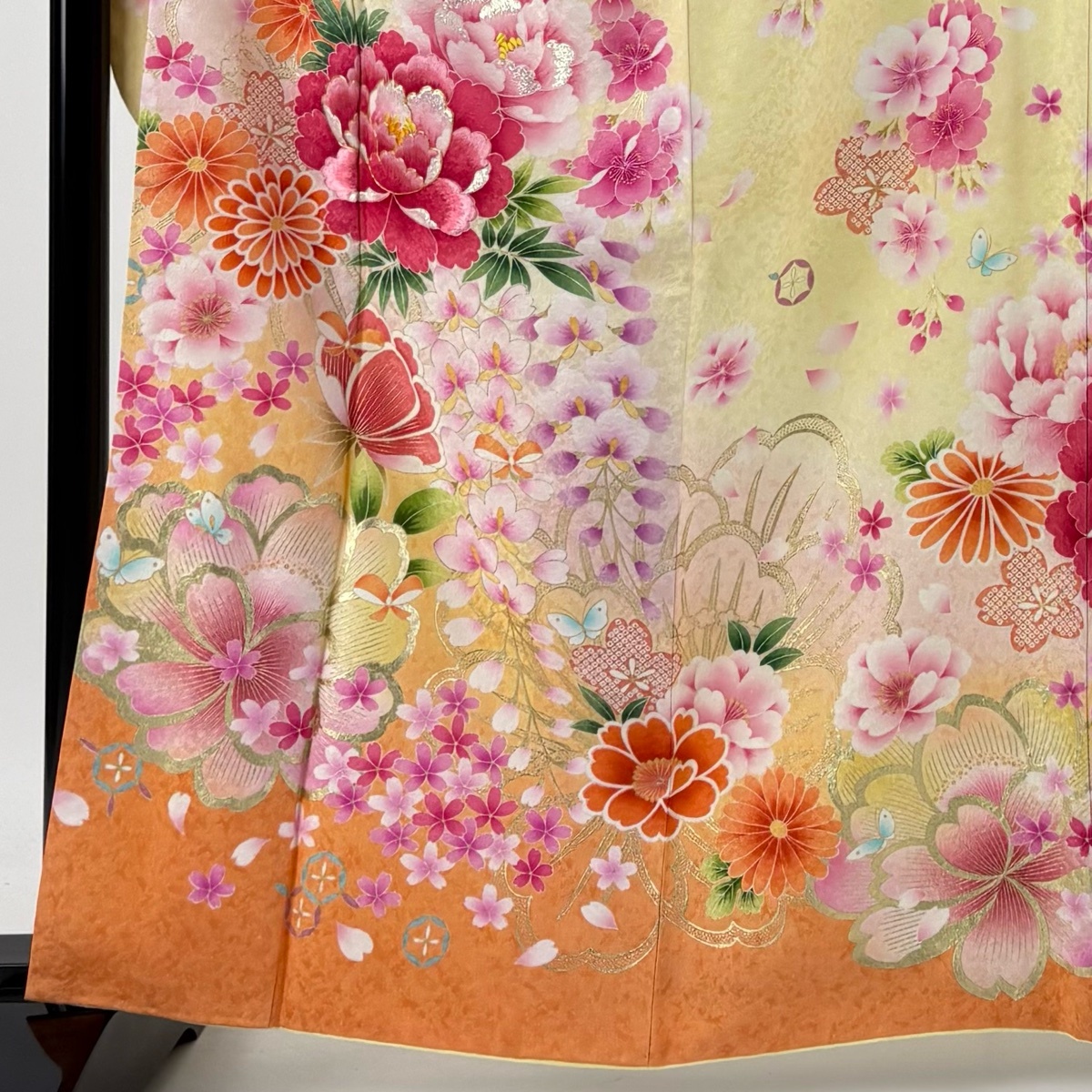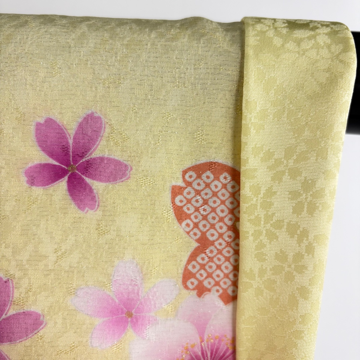 振袖 美品 逸品 牡丹 蝶 銀通し 刺繍 薄黄 袷 身丈162 裄丈65 M 正絹 【中古】 |
