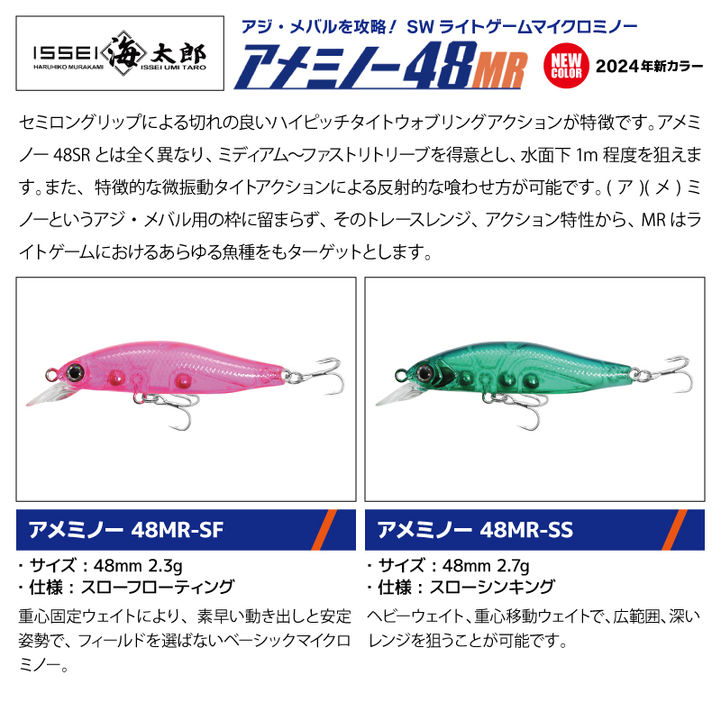 | 商品名 | 海太郎 アメミノー 48MR-SS カブラグリーンテールグロー 新カラー2024 釣りライトゲーム専用マイクロミノー 48mm ルアー ミノー issei | ||||||||||