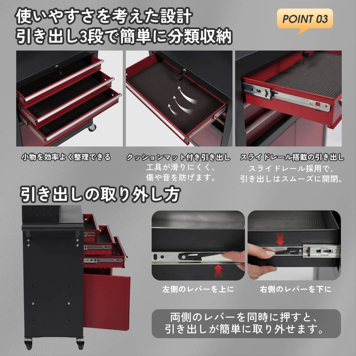• ◎04 【使いやすさを考えた設計】【引き出し3段で簡単に分類収納】小物を効率よく整理できます。【クッションマット付き引き出し】工具が滑りにくく、傷や音を防げます。【スライドレール搭載の引き出し】すべての引き出しはスライドレールを採用しており、スムーズに開閉できます。【引き出しの取り外し方】左側のレバーを上に。右側のレバーを下に。両側のレバーを同時に押すと、引き出しが簡単に取り外せます。