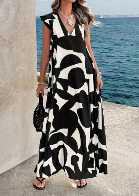 黒と白の抽象的なパターンが特徴のフレンチスリーブロングドレス、カジュアルでリラックスしたスタイルに最適。