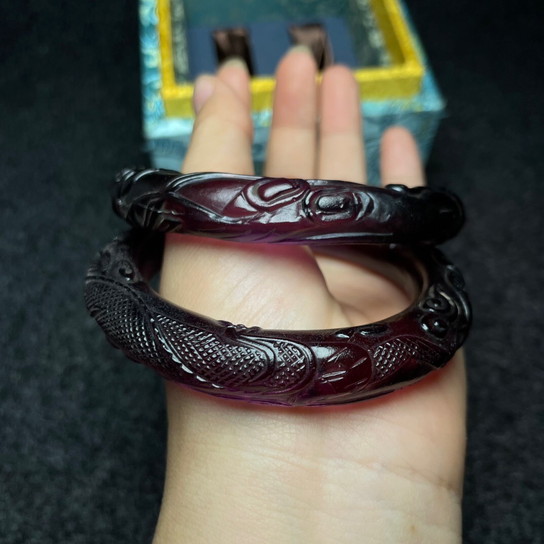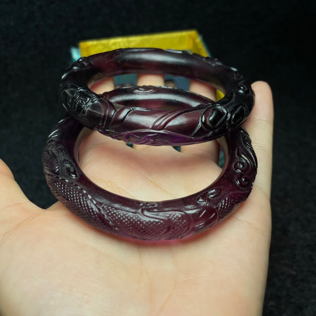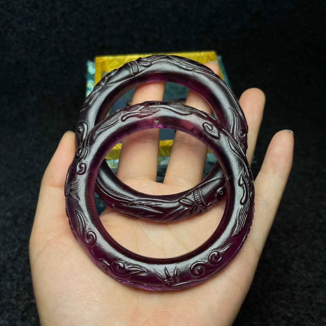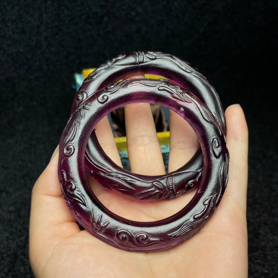 『清・琉璃製・細密彫・腕輪一對・箱付・根付・裝身具』極細工 置物 古賞物 中国古玩 中国古美術