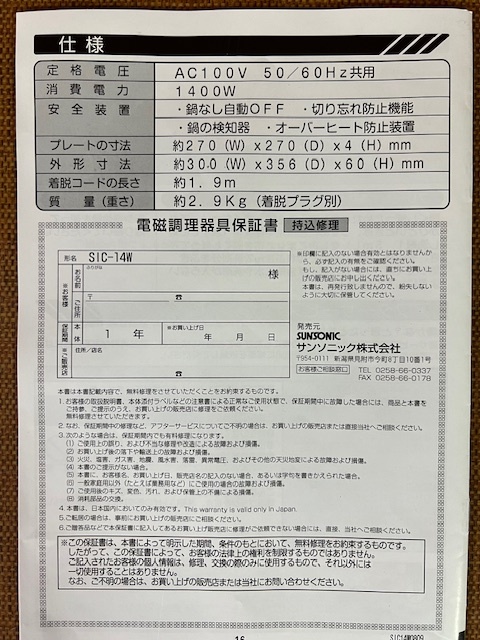 SUNSONIC 電磁調理器 IH COOKING HEATER SIC-14W