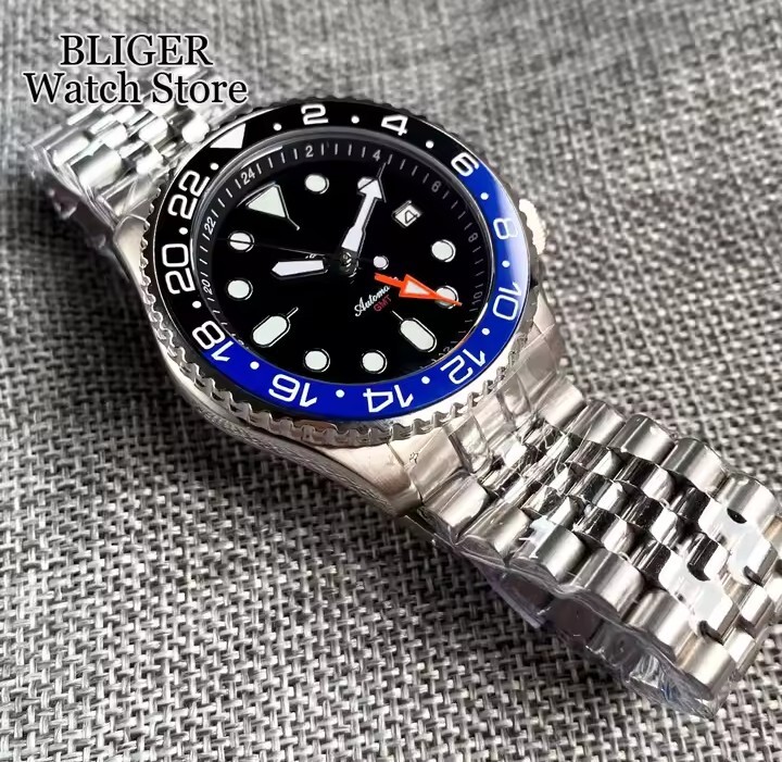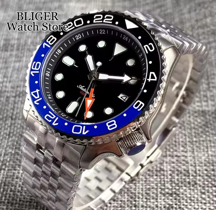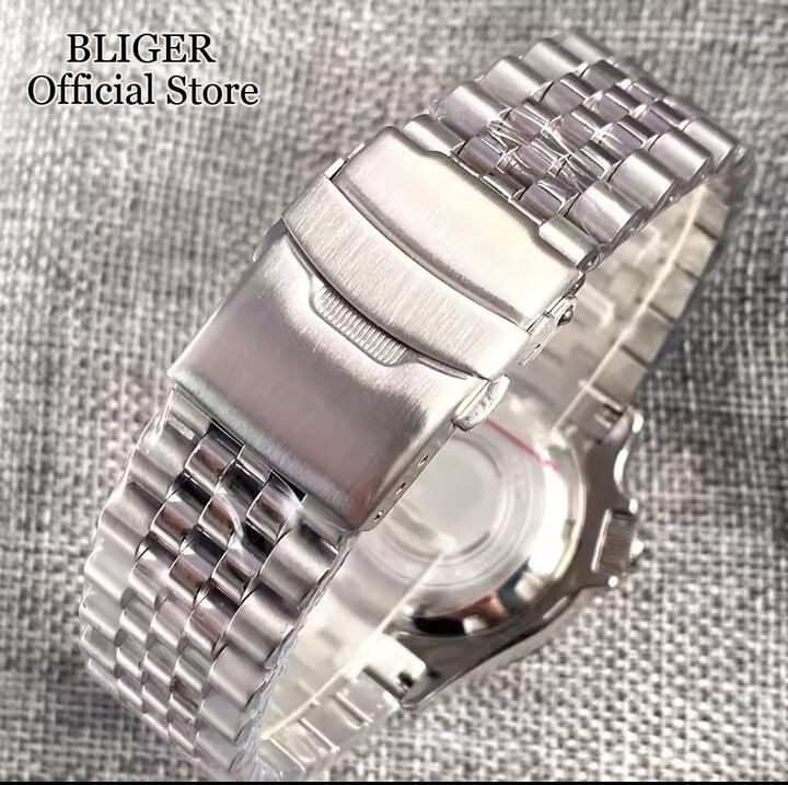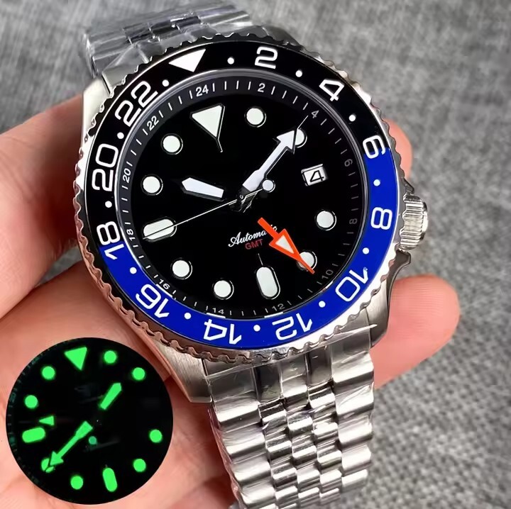 【新品未使用】ダイバー 自動巻き 腕時計シルバーベルト防水サファイアガラスビジネスウォッチ機械式ブラック文字盤ブルー