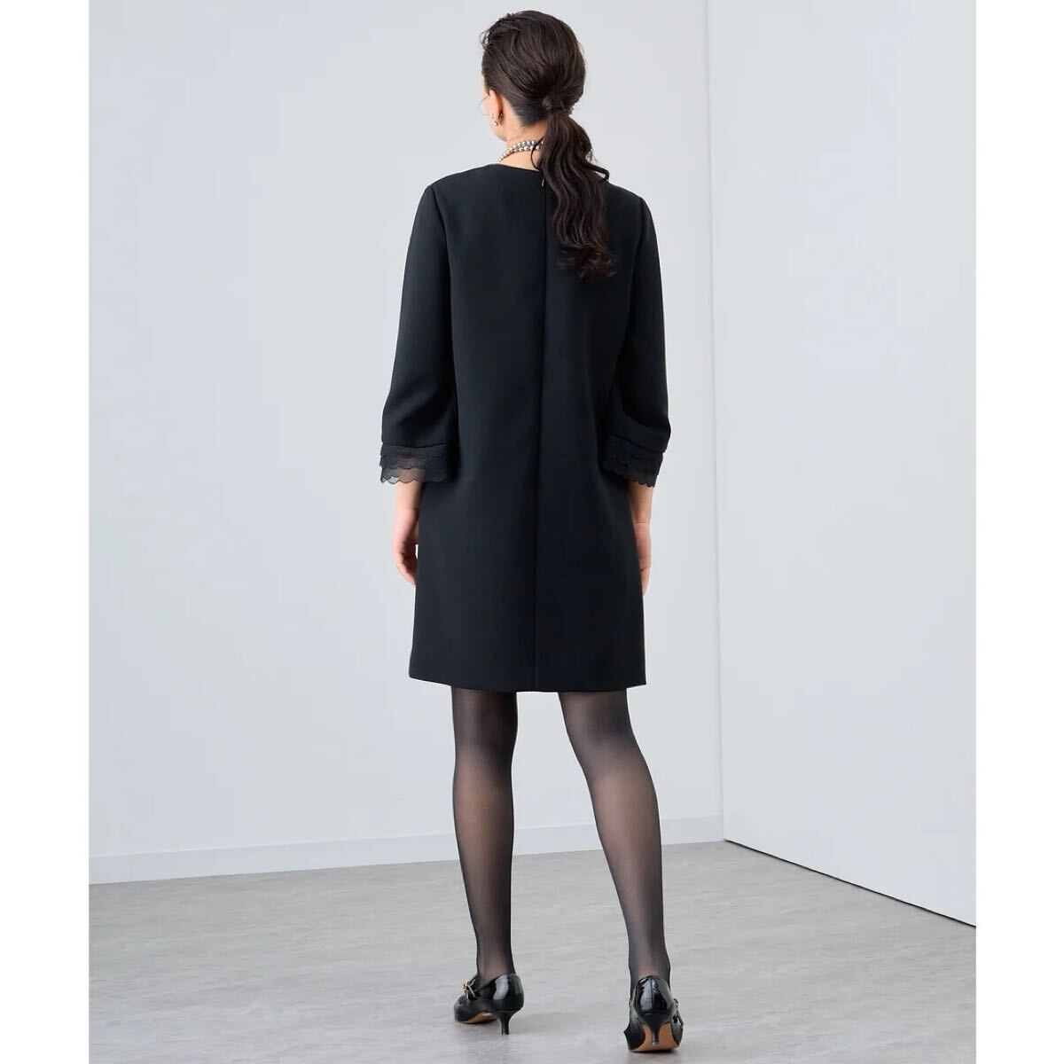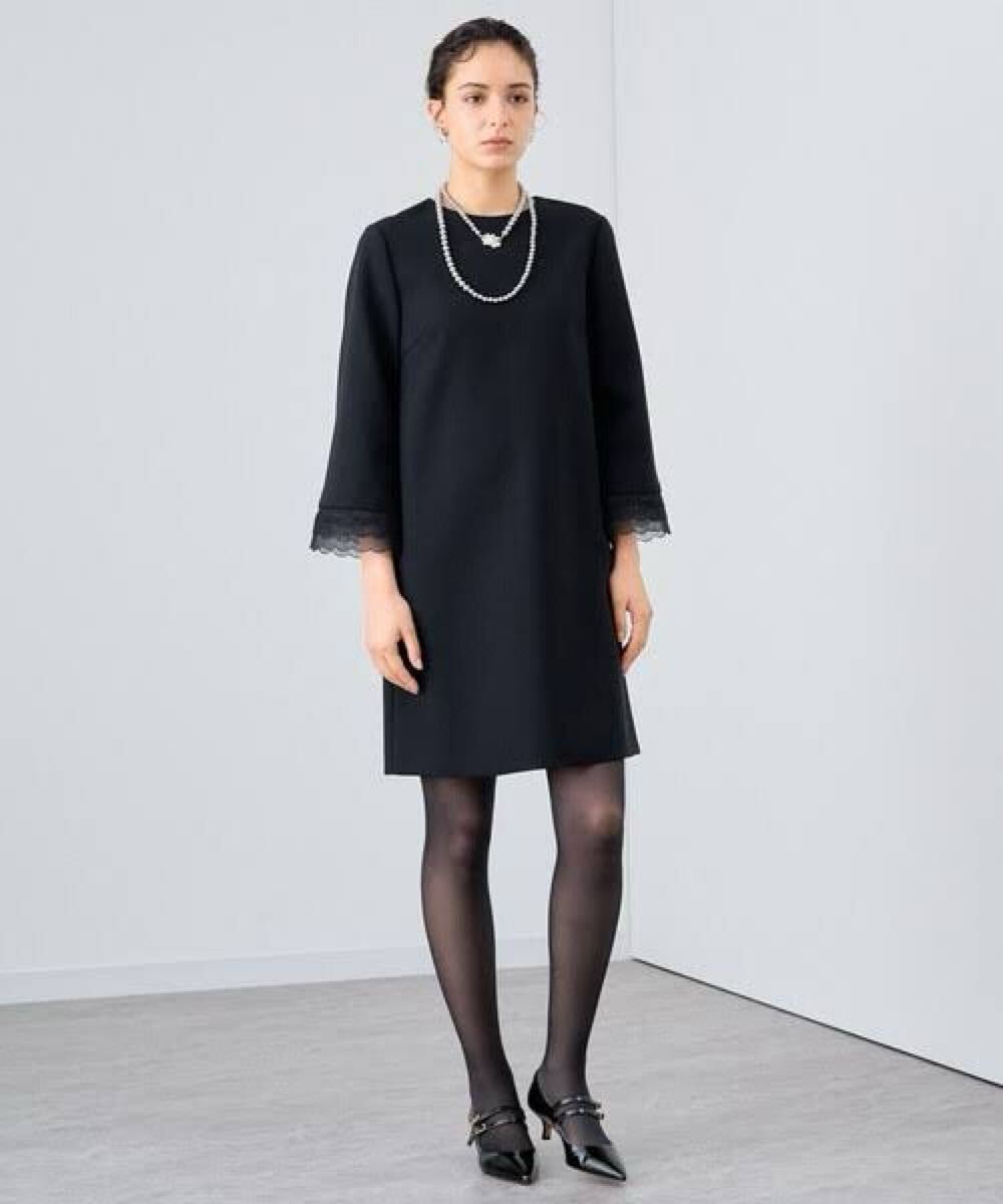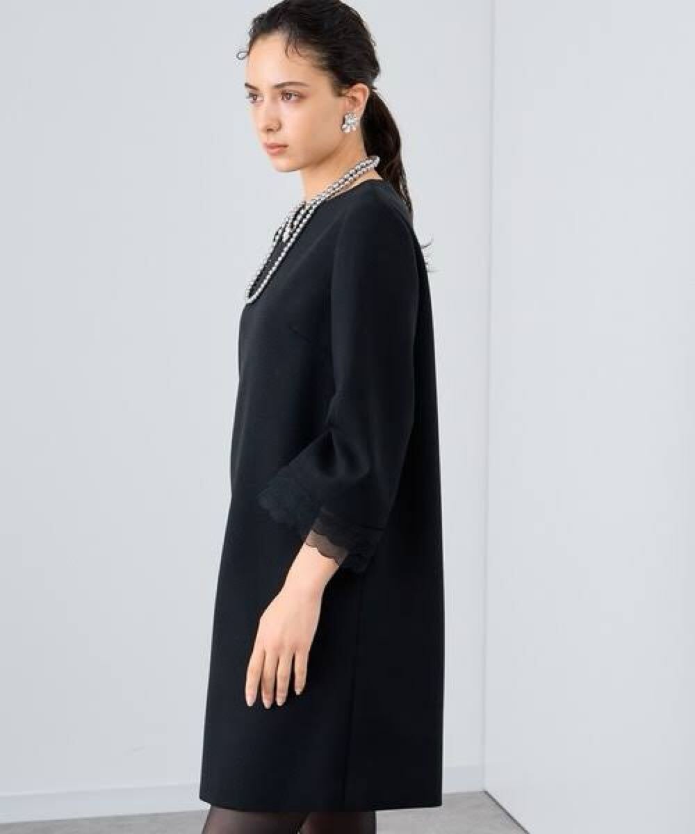 ウール強撚糸をさらに強く撚りをかけたジョーゼット組織は、ややシャリ感があり、毛羽立ちがほとんどない上品な素材に仕上げています。イタリアインポートの繊細なスカラップレースを使用しています。袖口に3段施したスカラップレースがデザインポイントのシンプルなサックワンピース。上品な透け感と、大き目なスカラップが大人っぽい印象です。袖口に重なったスカラップレースが他と差のつく、大人なミニ丈ワンピースです。今シーズン気になるミニ丈レングスは上質な素材感とミニマルかつきちんと華やかになれるデザインポイントで子供っぽくならず、ぜひお試しいただきたい1点です。