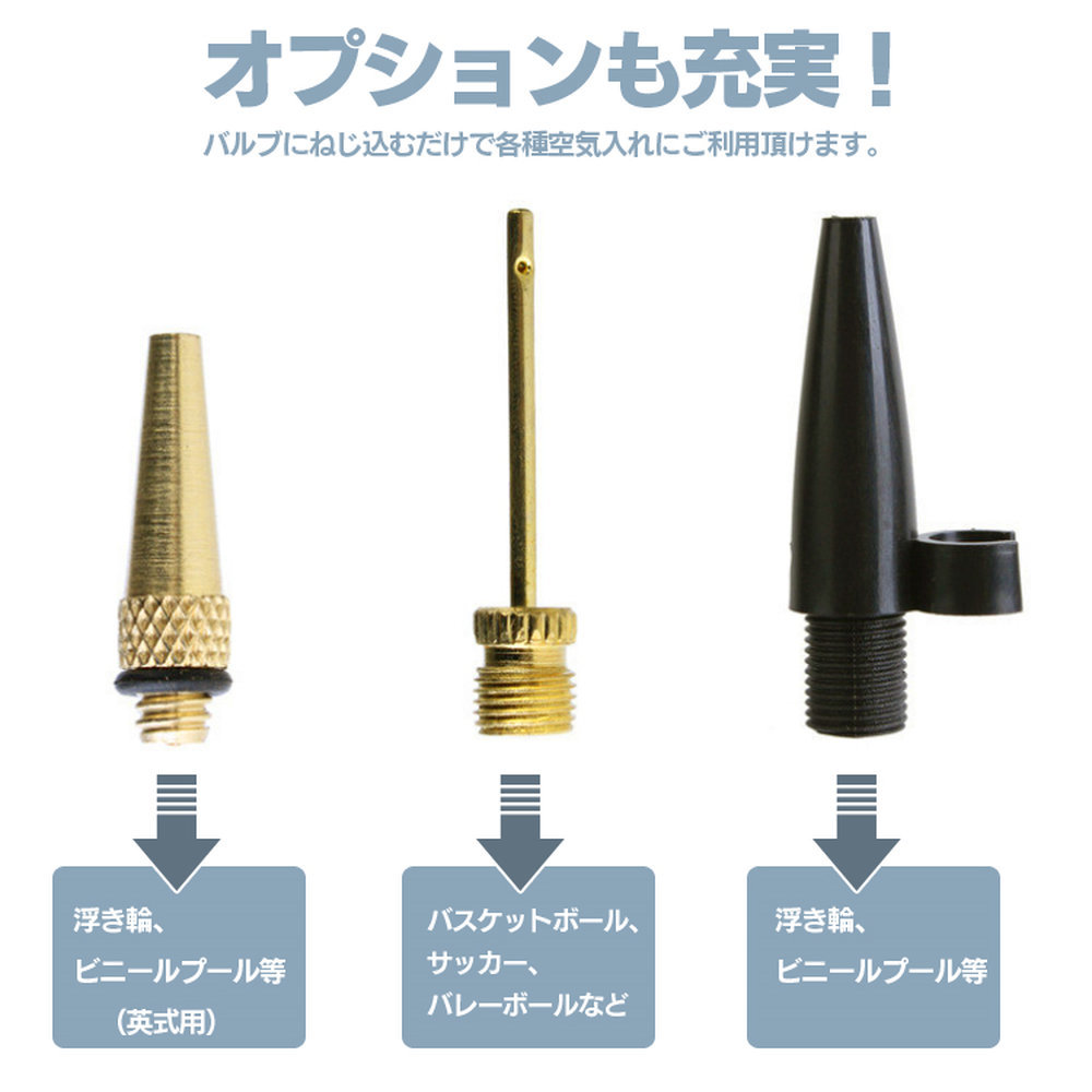 自転車用タイヤだけでなく、サッカー・バスケットボール・風船・浮き輪などにも様々な空気入れにご利用いただけます。