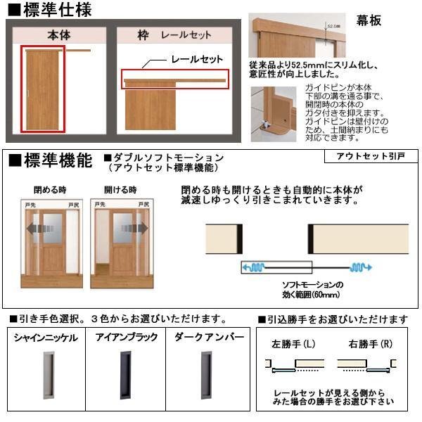 商品紹介 | ○ トステムの室内建具 クローゼット アウトセット引戸 ラシッサS Crea ○ デザインLAB ○ Wソフトモーション標準装備 ○ ノンケーシング * 色をお選び頂けます * 引手色をお選びいただけます。 * 引込勝手をお選び頂けます * オプション・化粧縁片面セットお選び頂けます * オプション・入隅用縦部材をお選び頂けます * 同時に複数セット、お買上げ頂けますと、送料の値引を致します。 違うサイズ(違う種類)との組合せでもOKです、是非お問合せ下さい。 |