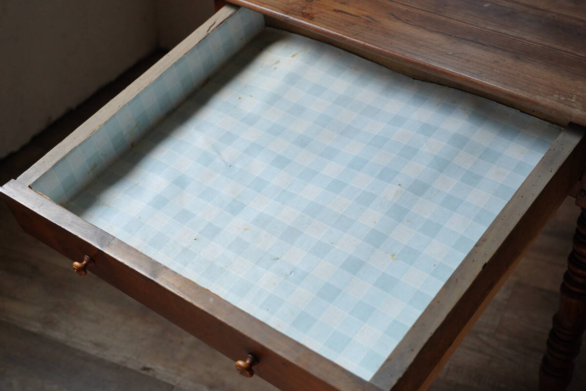 取っ手が2つの引出しを開けると、どこか懐かしい水色のチェック柄がお出迎え。