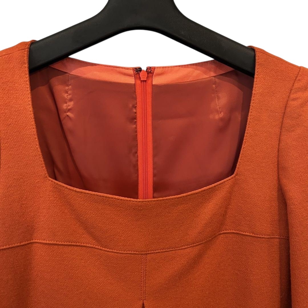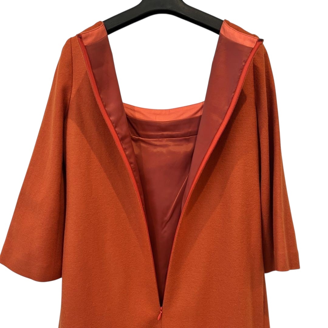 暖かみのあるテラコッタカラーと、美しいシルエットが魅力。ウール×ポリエステル素材で、秋冬にぴったりな上品ワンピースです。