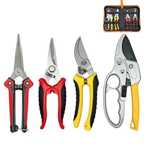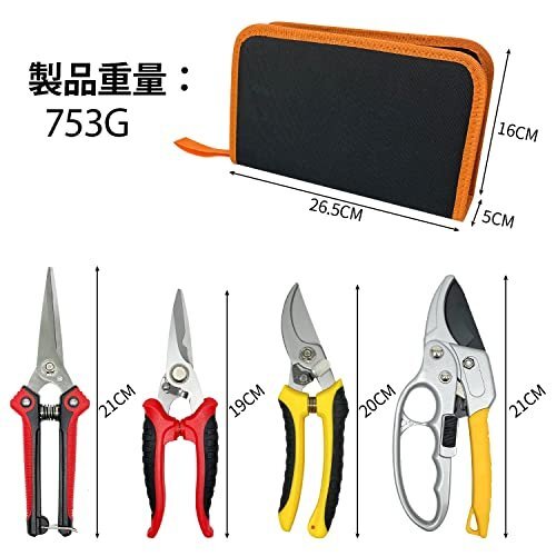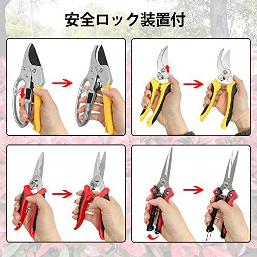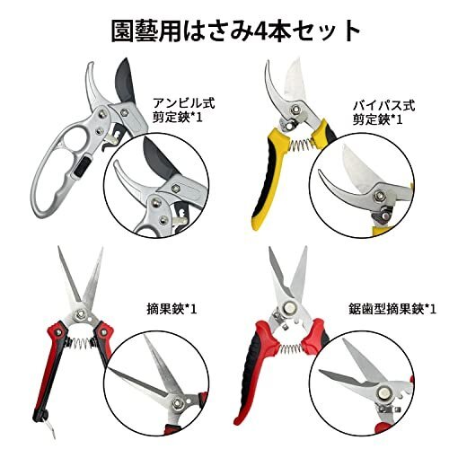 ブランド:Sutekusはさみ【セット内容】バイパス式剪定鋏*1(木、軟木、繊細な木や植物、生花等の切断) アンビル式剪定鋏*1(堅い枝、枯れ木、自生した強靭な木等の切断) 摘果鋏*1(摘果、芽切、野菜の収穫など柔らかい茎の切断) 鋸歯状の摘果鋏*1(滑り止め鋸歯状デザイン、枝の固定用くぼみがあり、電工ハサミとしても使用可能)