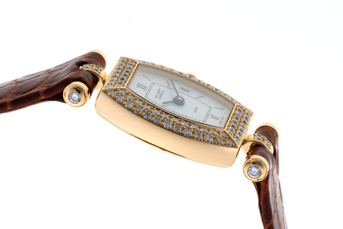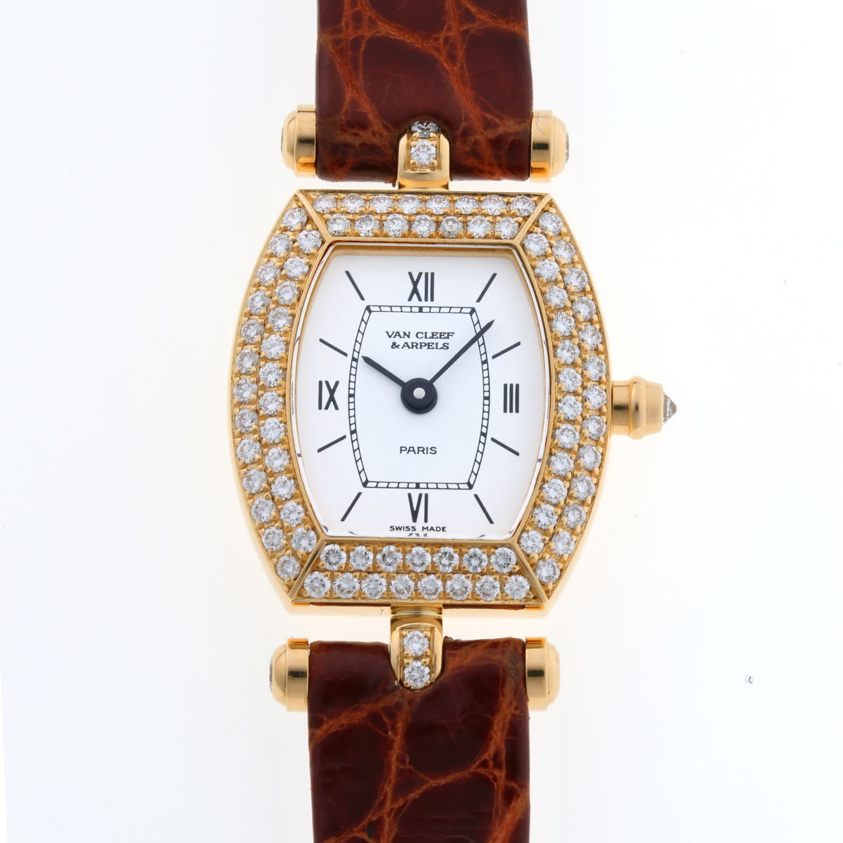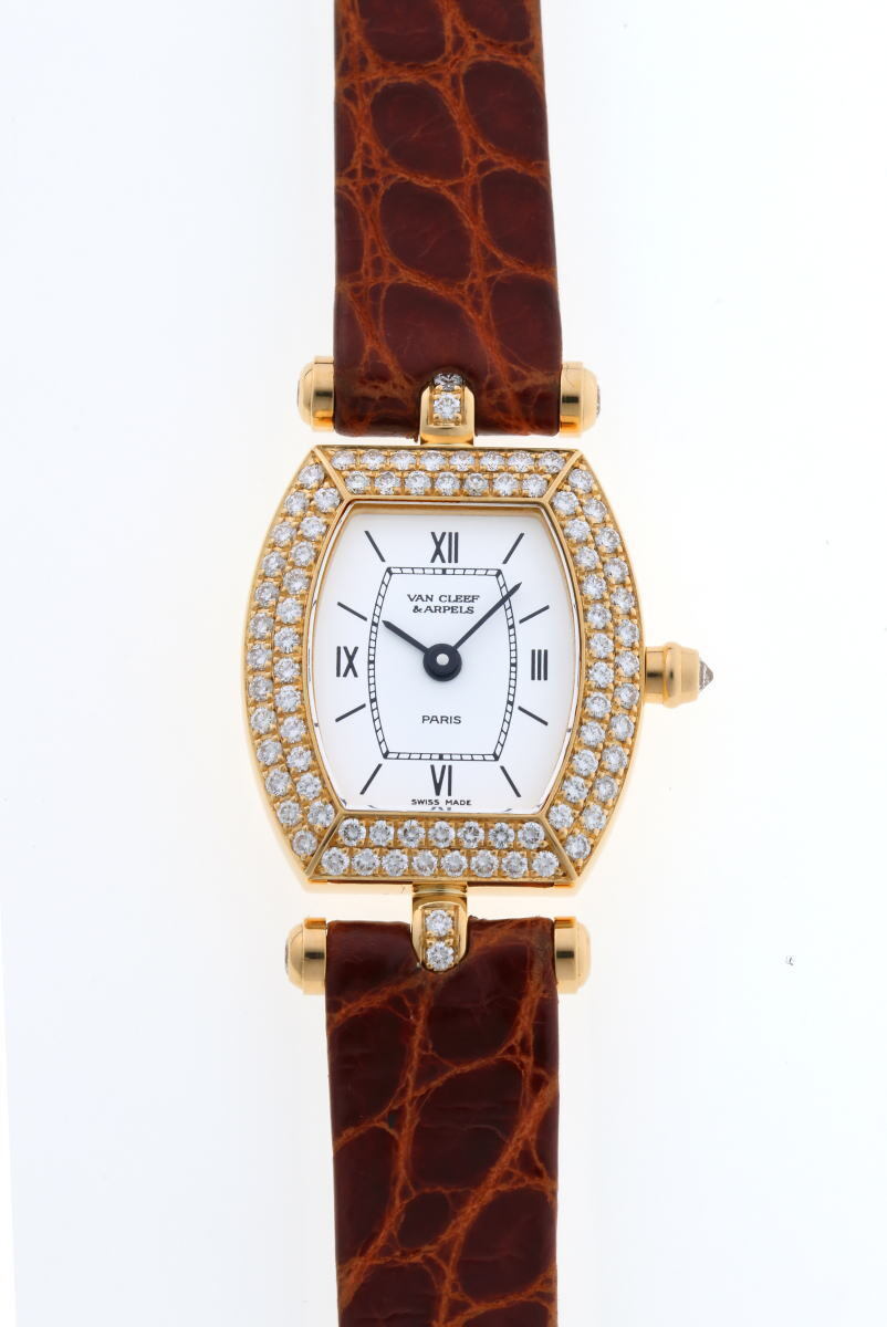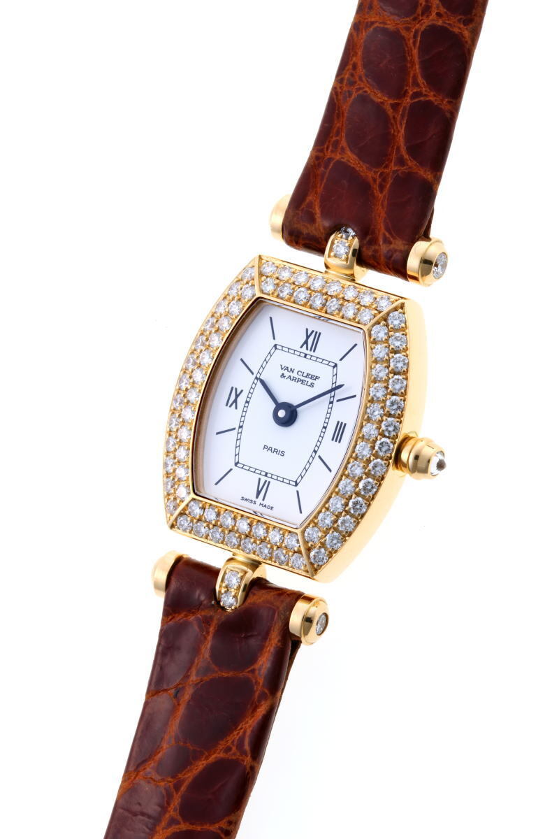 目立つダメージはありません。提携工房にて磨き済み。-VCAのトノーウォッチ。2重ダイヤモンドベゼル。イエローゴールド。