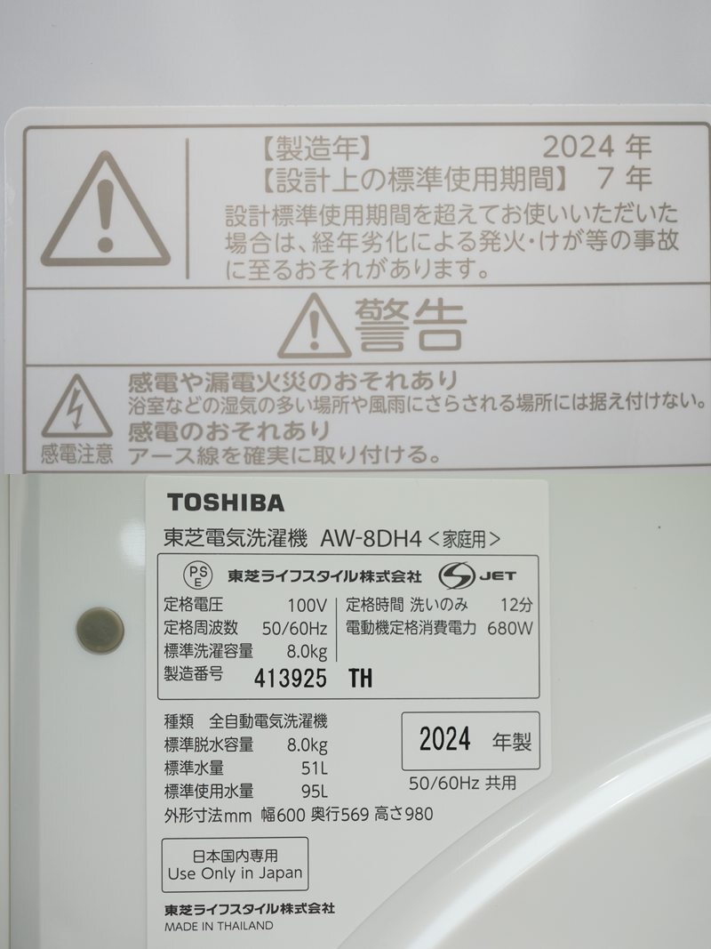 | 東芝 | AW-8DH4・2024年 | 本体 約98.0 x 60.0 x 56.9cm |