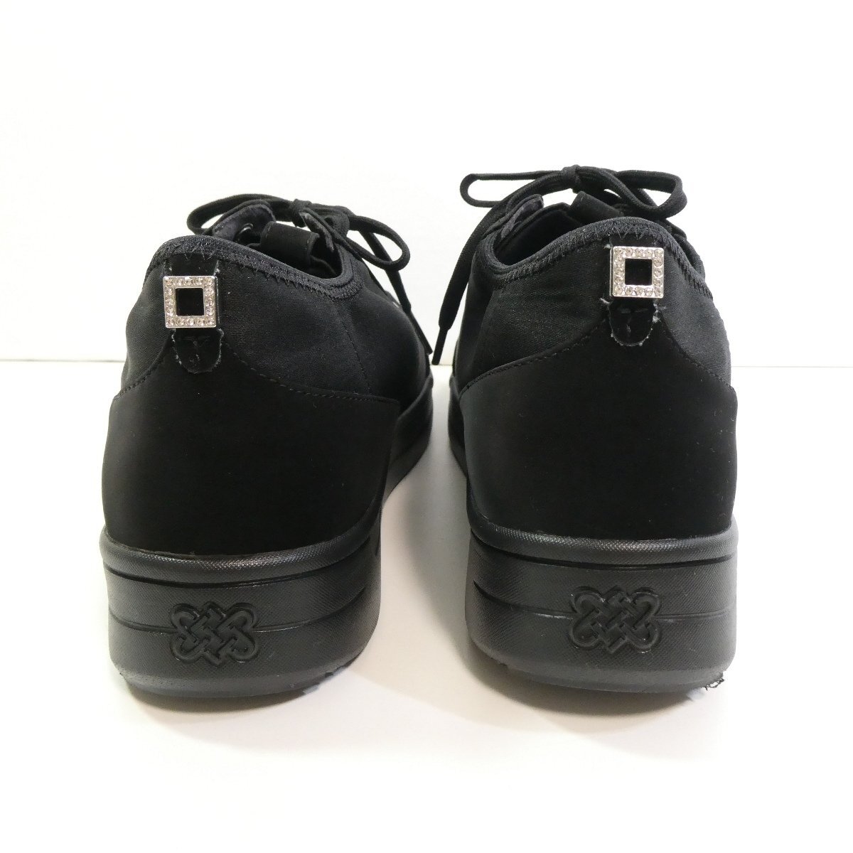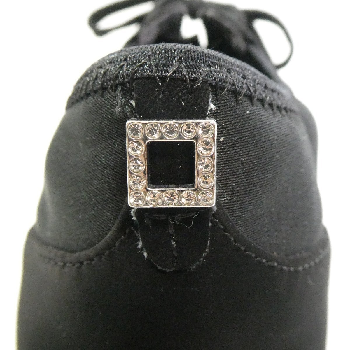 かかと部分のスクエアビジューがさりげないリッチポイント。ひもをほどかずにスッと履いてシュッと脱ぐことができます。