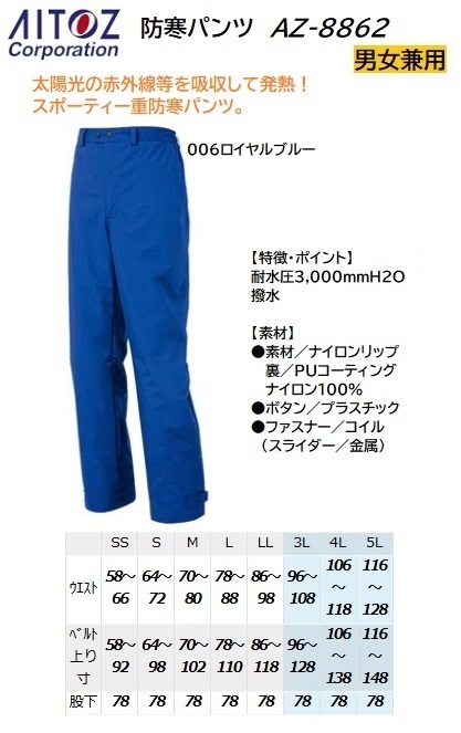 【超特価】◆アイトス [秋冬] 防寒パンツ AZ-8862【006ロイヤルブルー・SSサイズ】定価13640円・耐水圧3,000mmH2O・撥水の品、即決2980円