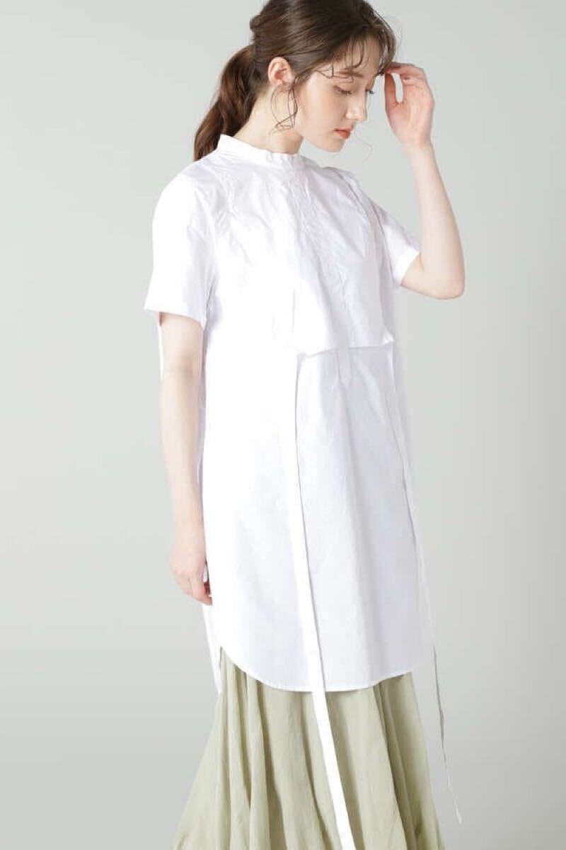 サイドに垂れたテープがアクセントになるドレスシャツ・フロントのフラップデザイン・サイドの長いテープ・ゆとりのあるサイズ感・ハイネックカラー・バックのボタン開閉【スタッフレビュー】フロントのフラップデザインがポイントのドレスシャツ。ゆとりのあるサイズ感にチュニック丈で今年らしいスタイリングを楽しめます。サイドのテープは後ろで結んでもかわいいですが、結ばずに垂らして着用するのが今年らしく決まり◎。ゆったりとしたハーフスリーブはイージーにまくってこなれ感のあるスタイリングがおすすめです。