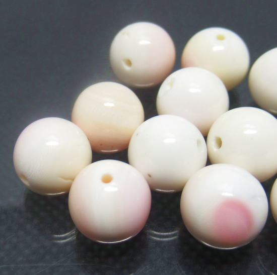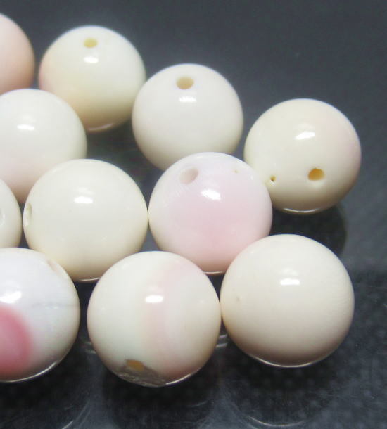 コンクシェルは、コンクパールという千から1万個に1個といわれる希少パールを作る母貝です。食用に乱獲されたことから数が激減し、現在では絶滅の危険性がある種として特定されています。ピンク色の部分をビーズ加工するため、色の美しい部分が生かせるカットは、大変、数が少なく、また、巻貝のため、厚みのある大きなビーズは更に作りにくくなります。母貝は、大変大きく、ビーズの何百倍もの大きさがあります。絶滅危惧であるため、いずれ国外への持ち出しも禁止になる可能性もあります。また、現在市場に出回っているもので、マザーオブパールを染色してコンクシェルに似せたものもありますのでお気をつけください。貝殻は、白からピンクになっているため、どこかの面に、ほぼ必ず白色や薄ピンクが入るので、均等にピンクになっているようなものは染めている可能性があります