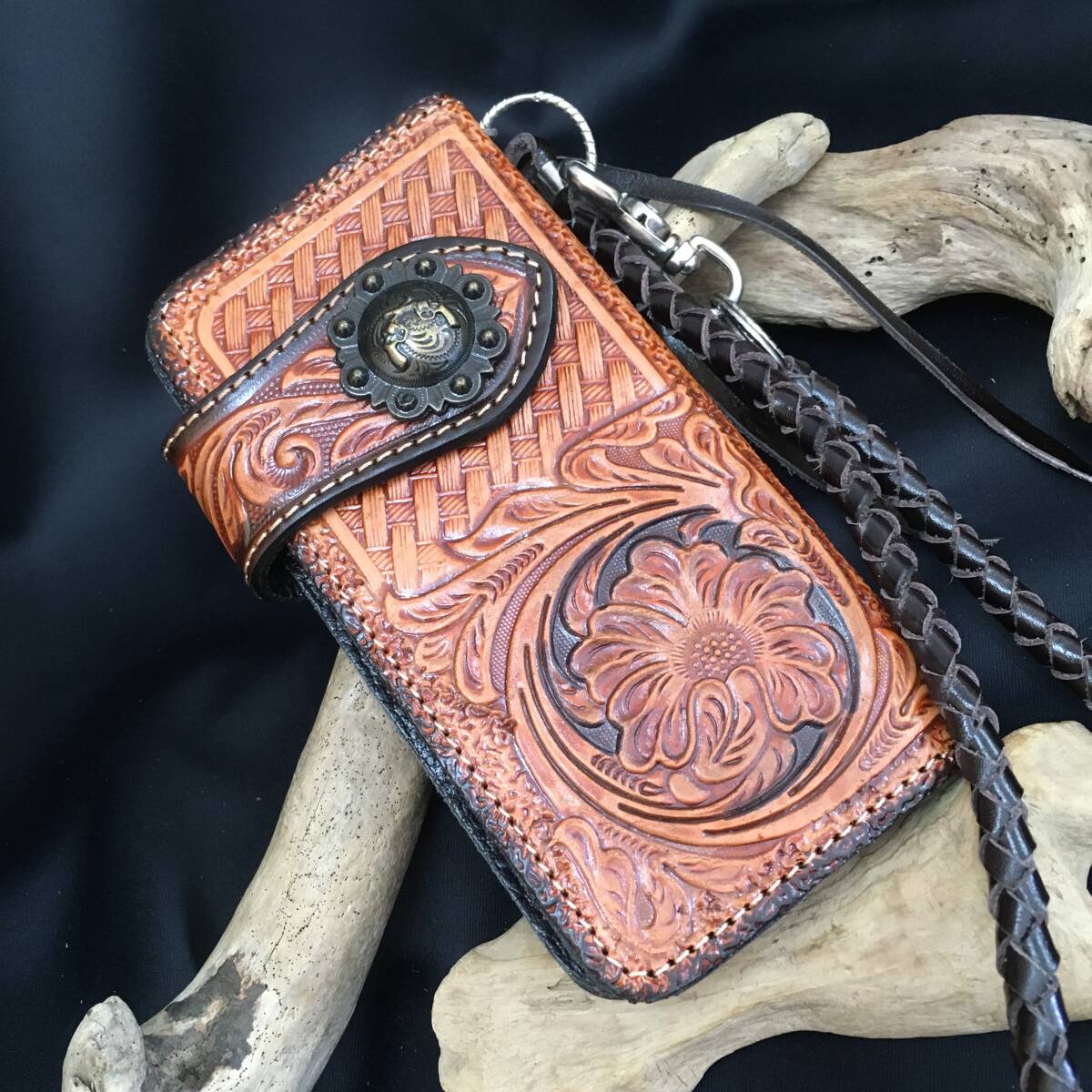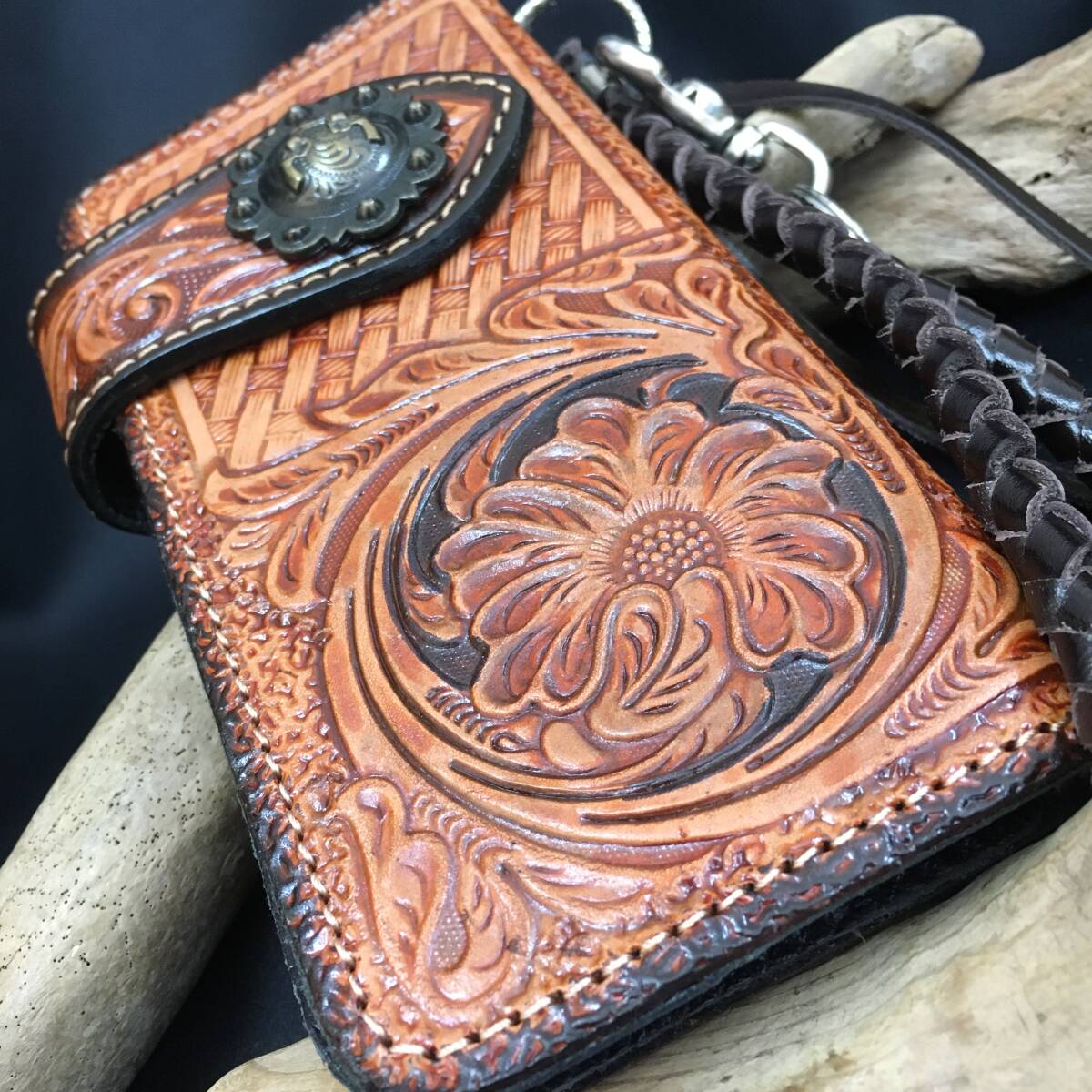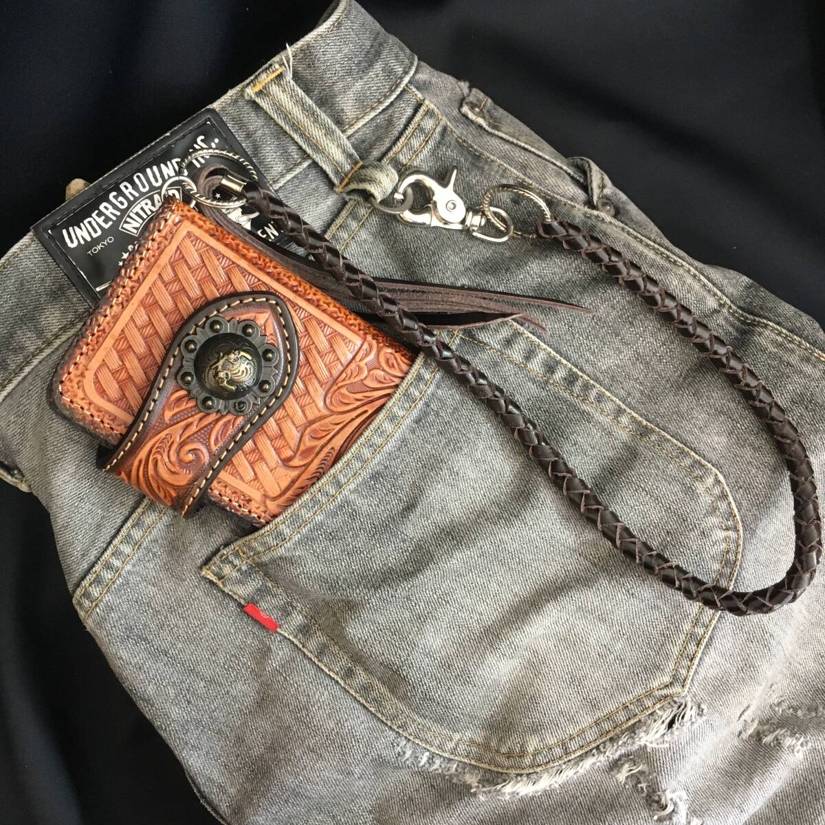 新品 本革レザー カービング型押し 長財布 メンズ ロングウォレット ロープ付き コンチョ ライダース アウトドア ツーリング 送料無料 73