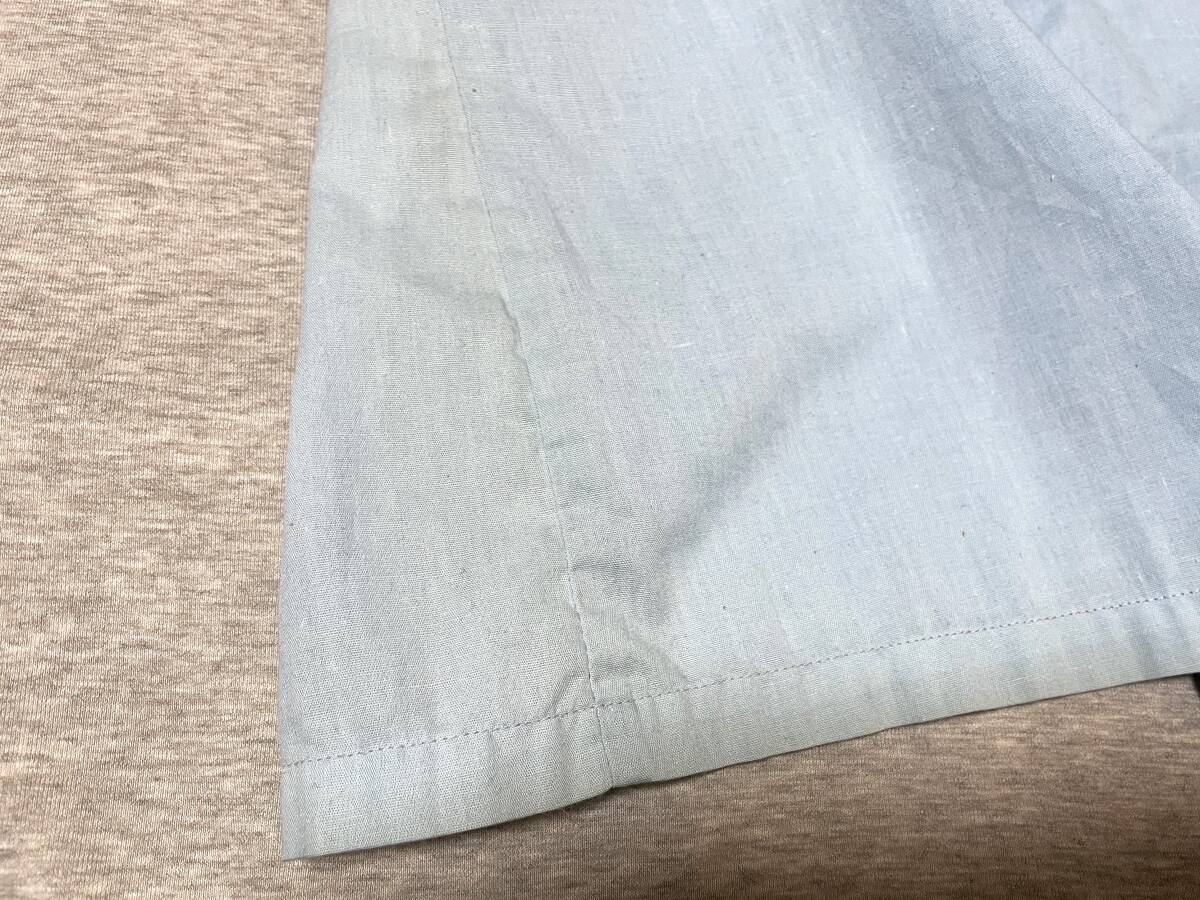 その他デザイン・ディテールは、襟の形状はやや小ぶりなレギュラーカラーと言った感じで(画像3)、襟芯が内包されており、前身頃(画像1)の開きはベース部分と共生地が使われた表前立て仕様で(画像4)、2つ穴のボタンが使われた7つボタン留め(画像1)、裾部はボックスカットで(画像1)、袖先はダブルステッチ(画像5上)、裾部はシングルステッチ仕上げとなっています(画像5下)