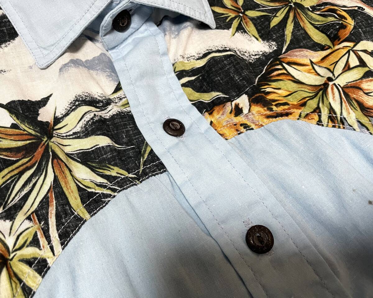 素材表記がやや不鮮明で多少不正確にはなりますが、"55% POLYESTER、45% COTTON"とあるよう思い(画像7)、本体ベース部分に使われている生地は70~80年代にシャツ地としてよく使われていたプレストのような生地で、プリント部分に使われている生地はベース部分より若干ハリ感があるよう感じられるプレスト生地、使われているボタンはウッド製(ココナッツのような感じです)ではないかと思います。