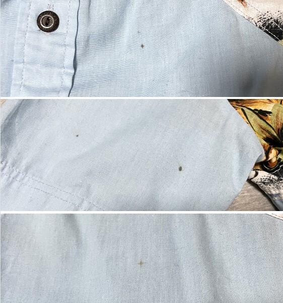 また、なにぶん随分と以前のシャツ類の使用および包装がない状態での保管品ですので、上記以外の多少の生地の小キズ感や汚れ感、また多少のシワ感やヨレ感、ボタン部分の小キズ感等はあるかと思いますが、使用に支障のあるダメージはなく、まだまだ充分にお使いいただける商品だと思います。