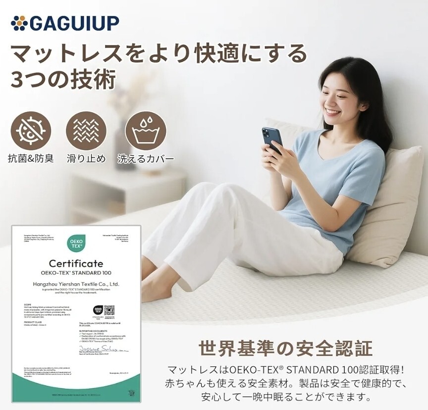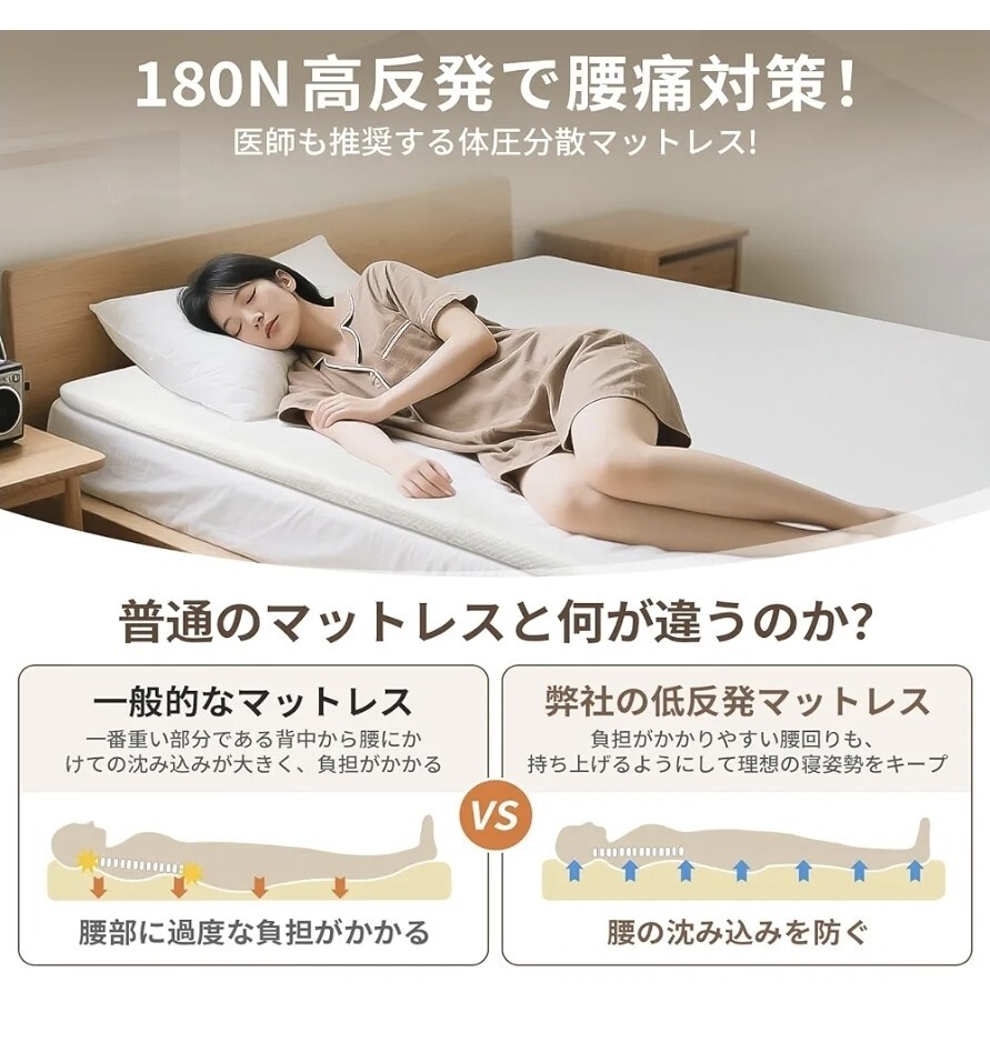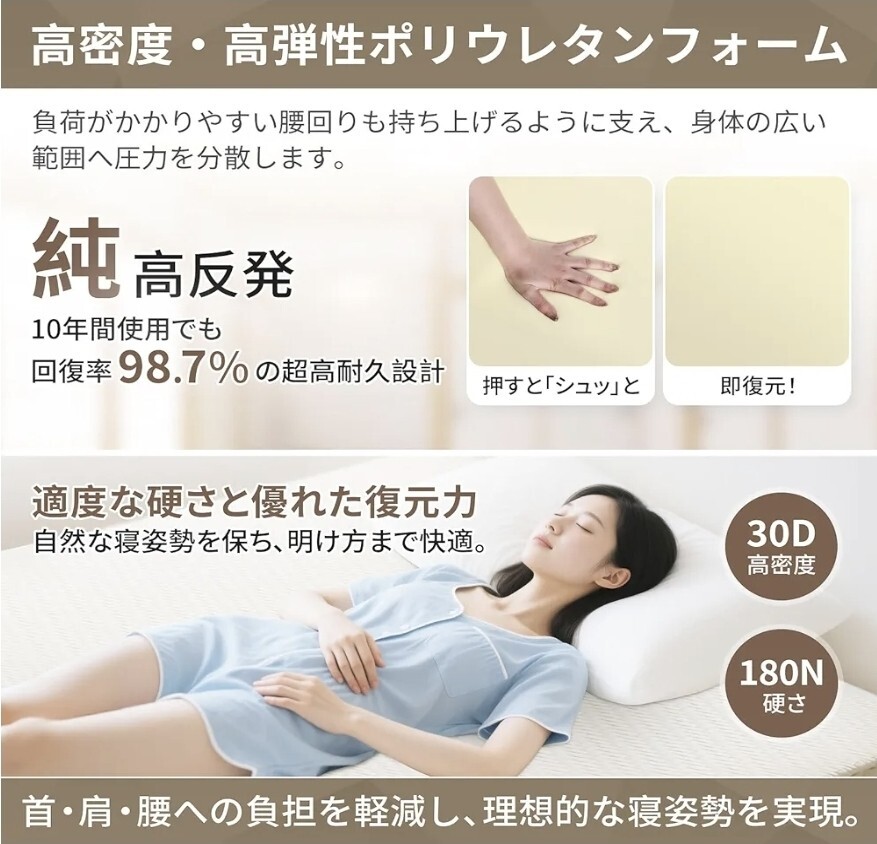 ウレタン:厚さ3cmの180N高反発ウレタンフォーム;通気性に優れ、ムレにくい設計で、夏でも快適にご利用いただけます。