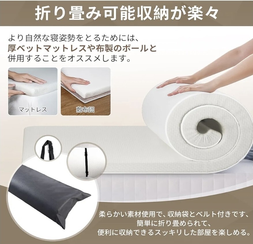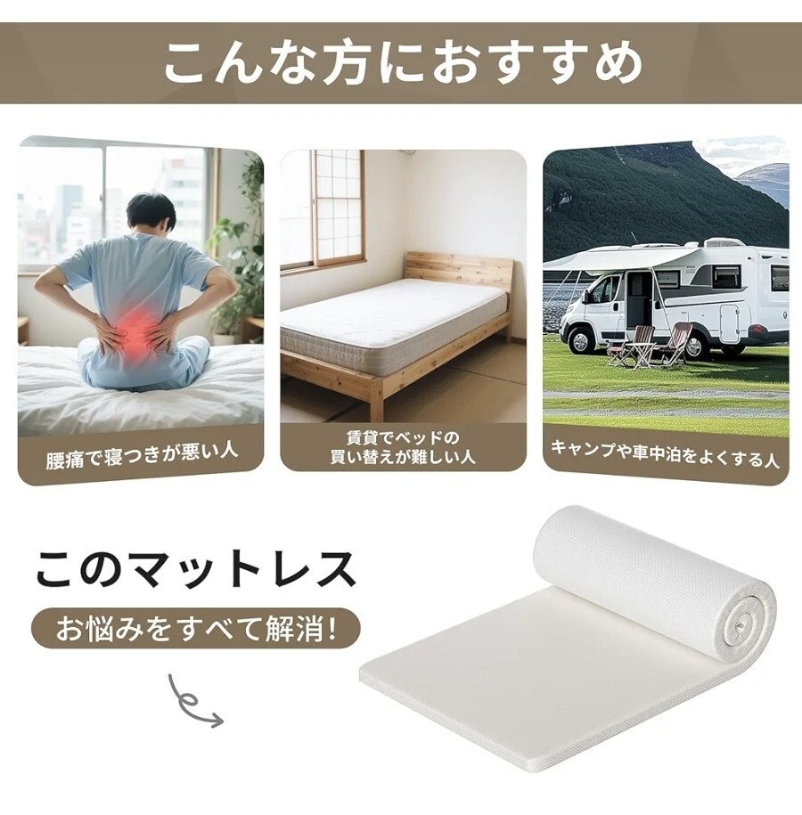 「体が痛い・寝心地が悪い・腰が痛くなる」等が発生する場合にお使いいただけます。30D高密度ウレタンフォーム採用で、体圧分散効果が高く、長時間使用でもへたりにくい設計です。お客様のお好みに合わせ、お手持ちの寝具に重ねるだけで極上の寝心地と、健やかで輝かしい目覚めが手に入ります。布団の上に敷いても、フローリングに直接敷いてもOK。さまざまなシーンでご利用いただけます。新感覚の寝心地をお試しください。