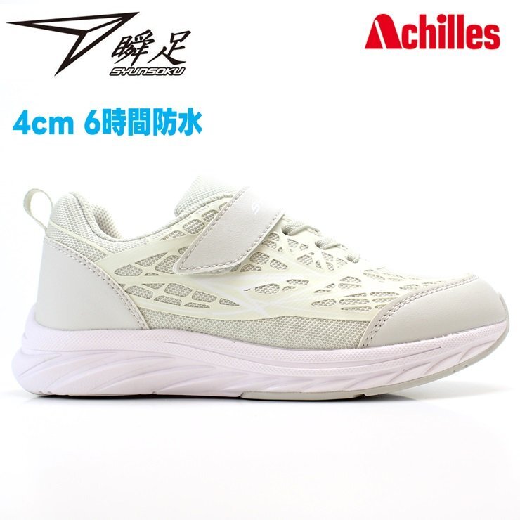 瞬足の防水機能付きスニーカー。 接地面から4cmの耐水テストで6時間をクリアした独自の防水設計を採用したモデルです。 ・独自の防水設計 接地面から4cmの耐水テストで6時間をクリアした独自の防水設計を採用。 ・グリップ力に優れたラバー意匠 地面を面で捉えるラバー意匠と、瞬足のアイデンティティである「左右非対称ソール」が左回りのコーナリングで優れたグリップ力を発揮します。 ・履き心地に配慮した設計 従来の瞬足防水設計モデルに比べ、靴底の屈曲性がよく、さらに柔らかいアッパー材を採用することで、より快適な履き心地を実現。 ・子供の足に合わせた設計ラスト 現代の子供の足(甲低、幅広傾向)に合わせた新設計のラストを採用。ゆったりとした足入れの3Eワイド設計です。 | |
