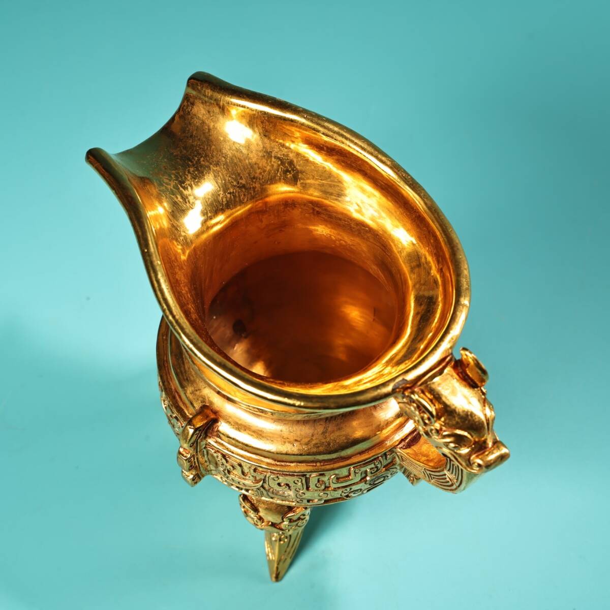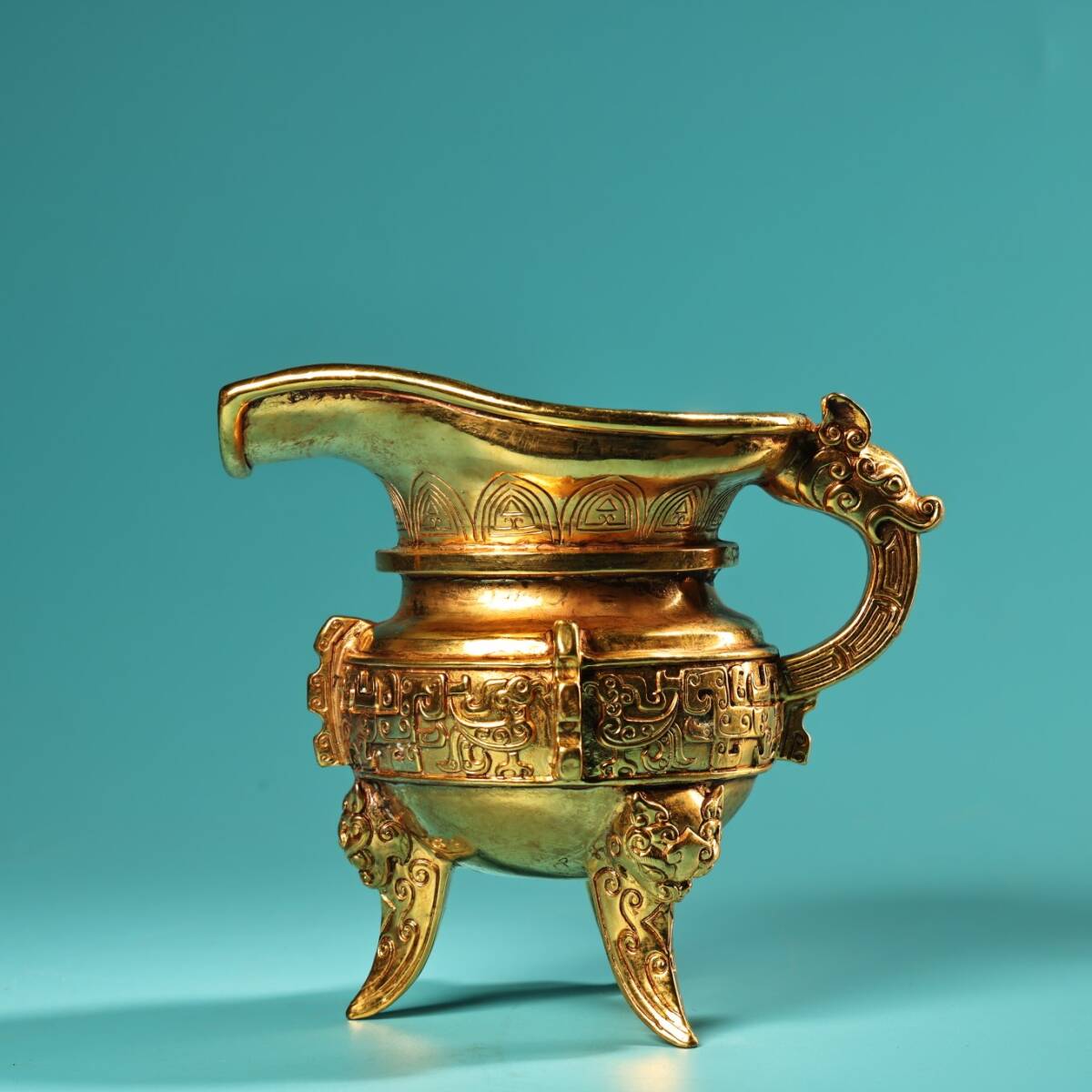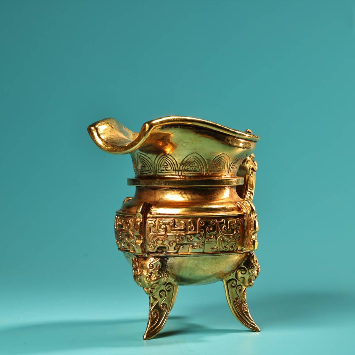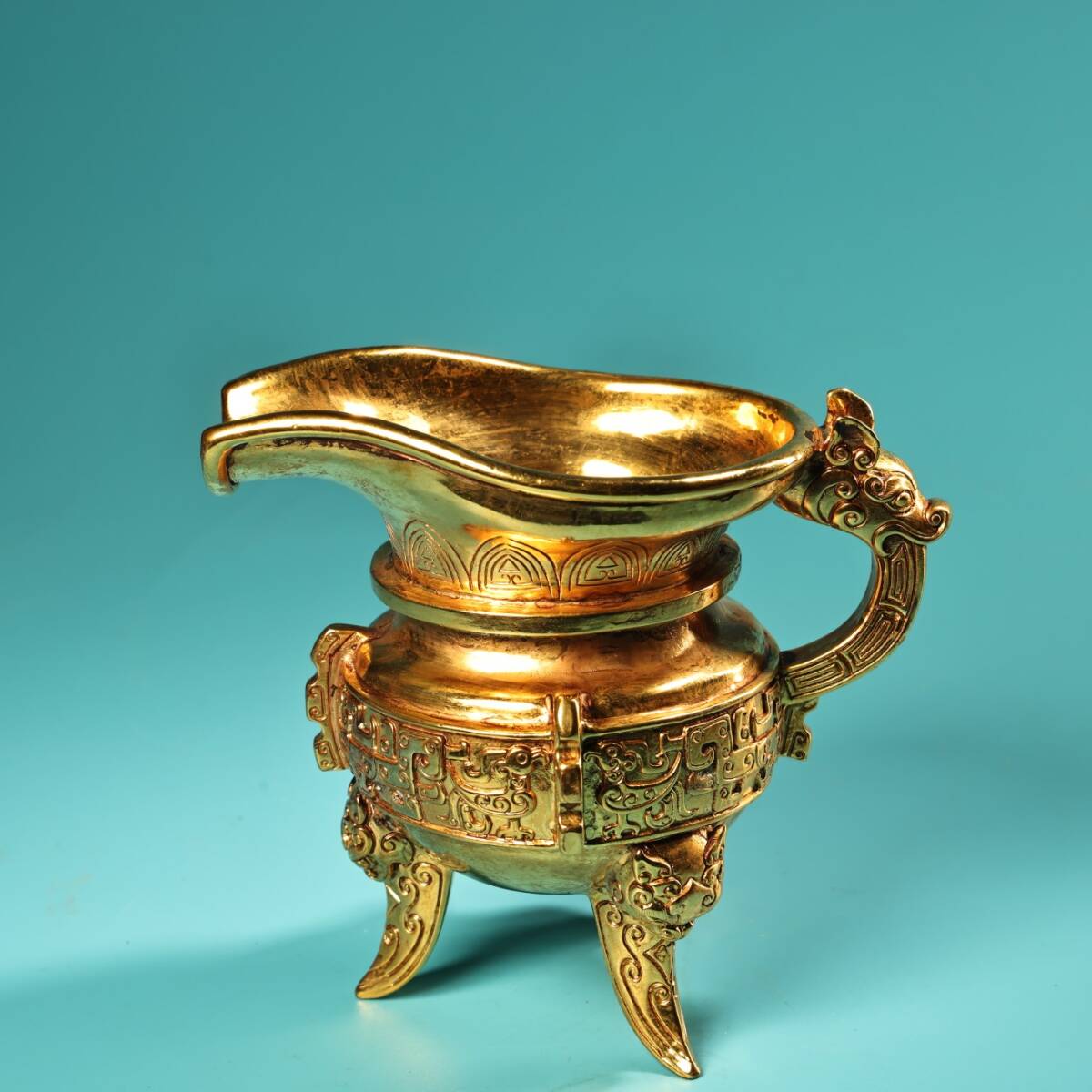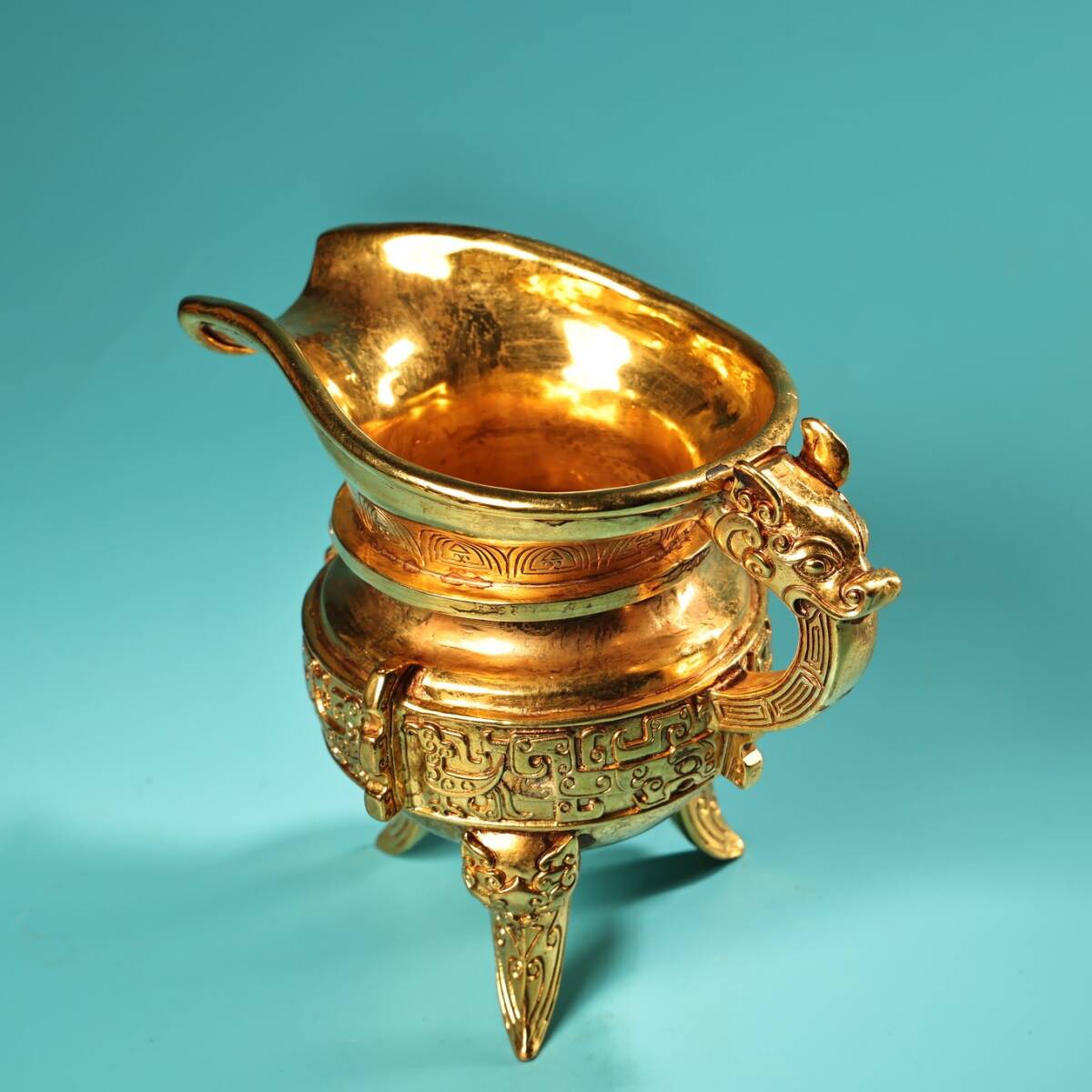 唐物 清 純銅 彫刻 鏨花塗真金 三腿酒杯 銅製品 銅器 極細工 古美術品 時代物 中国古玩 骨董品 D68