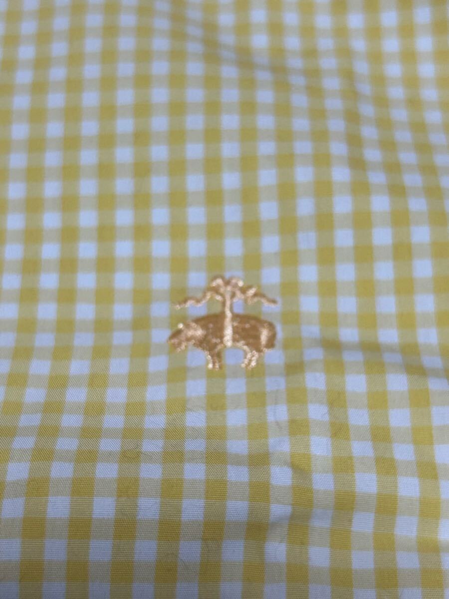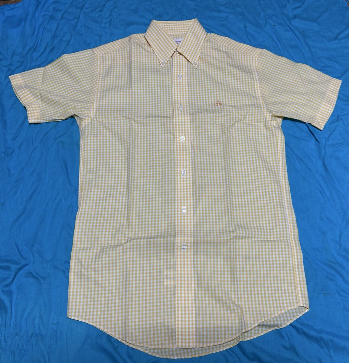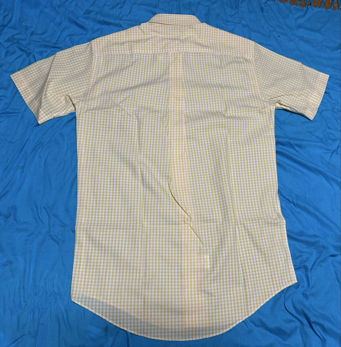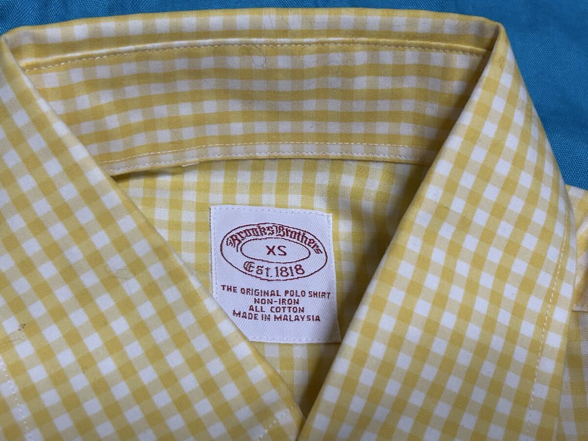 ブルックスブラザースの半袖、イエロー×ホワイトのギンガムチェック柄のボダンダウンシャツです。生地はコットン100%、サイズはXS表記、実寸は肩幅約46センチ、身幅約53センチ、着丈約79.5センチ、袖丈約22.5センチです。ボタンには「BROOKS BROTHERS」ネーム入り。左胸にお馴染みのゴールデンフリースの刺繍入り。あまり使用感もなく、状態良好です。デニム、チノパンその他何でも合わせやすい色柄かと思います。