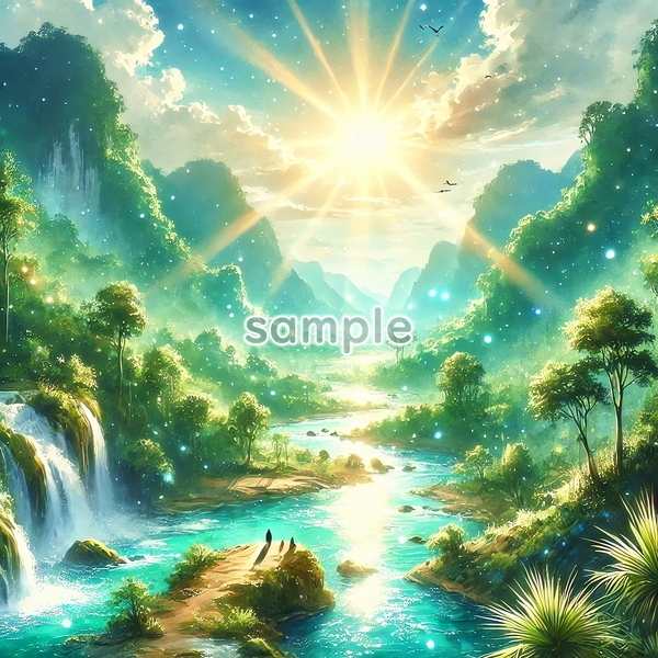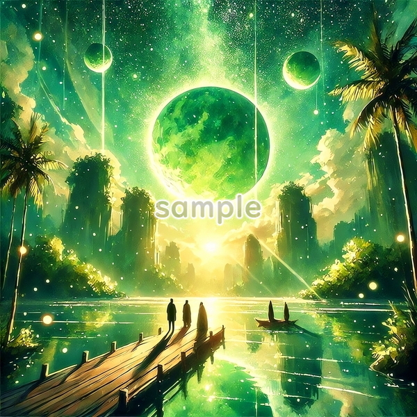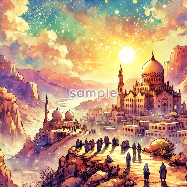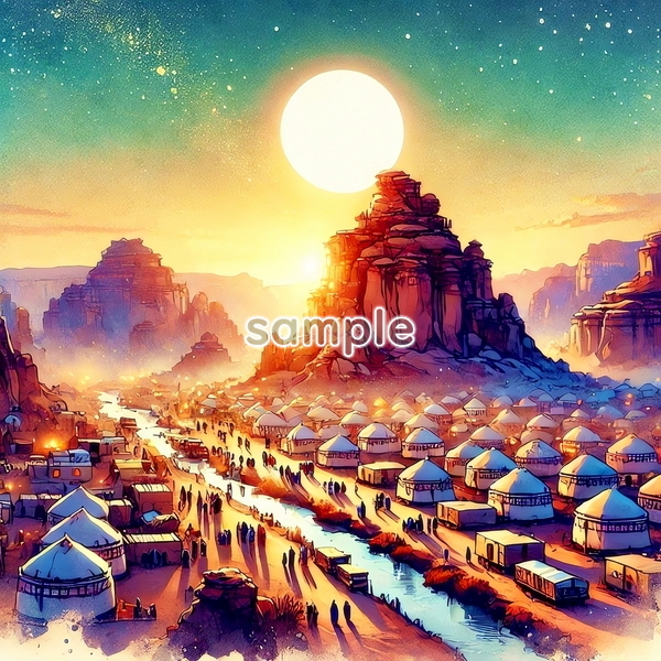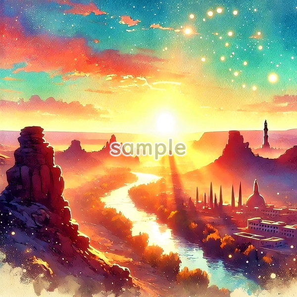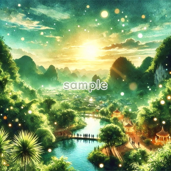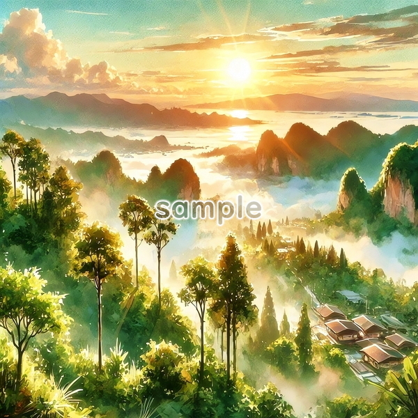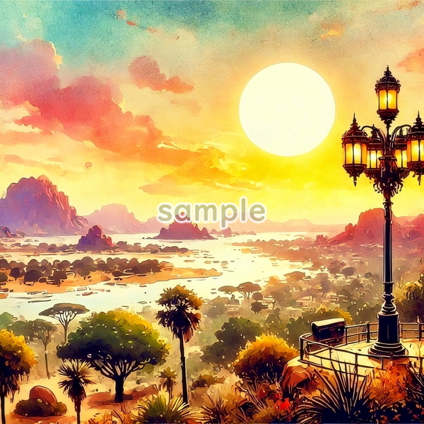 | チャド 世界国景色 緑と夕日と光 水彩 オリジナル絵イラスト 154P Chad World country scenery green sunset light watercolor Original painting art picture image material |