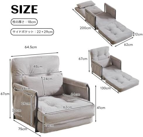 • 【3WAY仕様|使い方自由自在】1台で3通りの使い方ができるマルチスタイルソファ。座椅子・ソファスタイル:読書やデスクワークなど、集中したい時に最適。しっかりと腰を支えて姿勢が崩れにくい。ソファとして使う際は、座面の厚さを調整できます。日常の状態では座面が約24 cmとしっかりした厚みがありますが、脚も一緒にゆったり休めたいときには座面を展開して使用することも可能です。その場合、座面の厚さは約12 cmになります。ベッドスタイル:背もたれを倒すだけで簡易ベッドに。昼寝やリラックスタイムに横になってゆっくりおくつろぎいただけます。