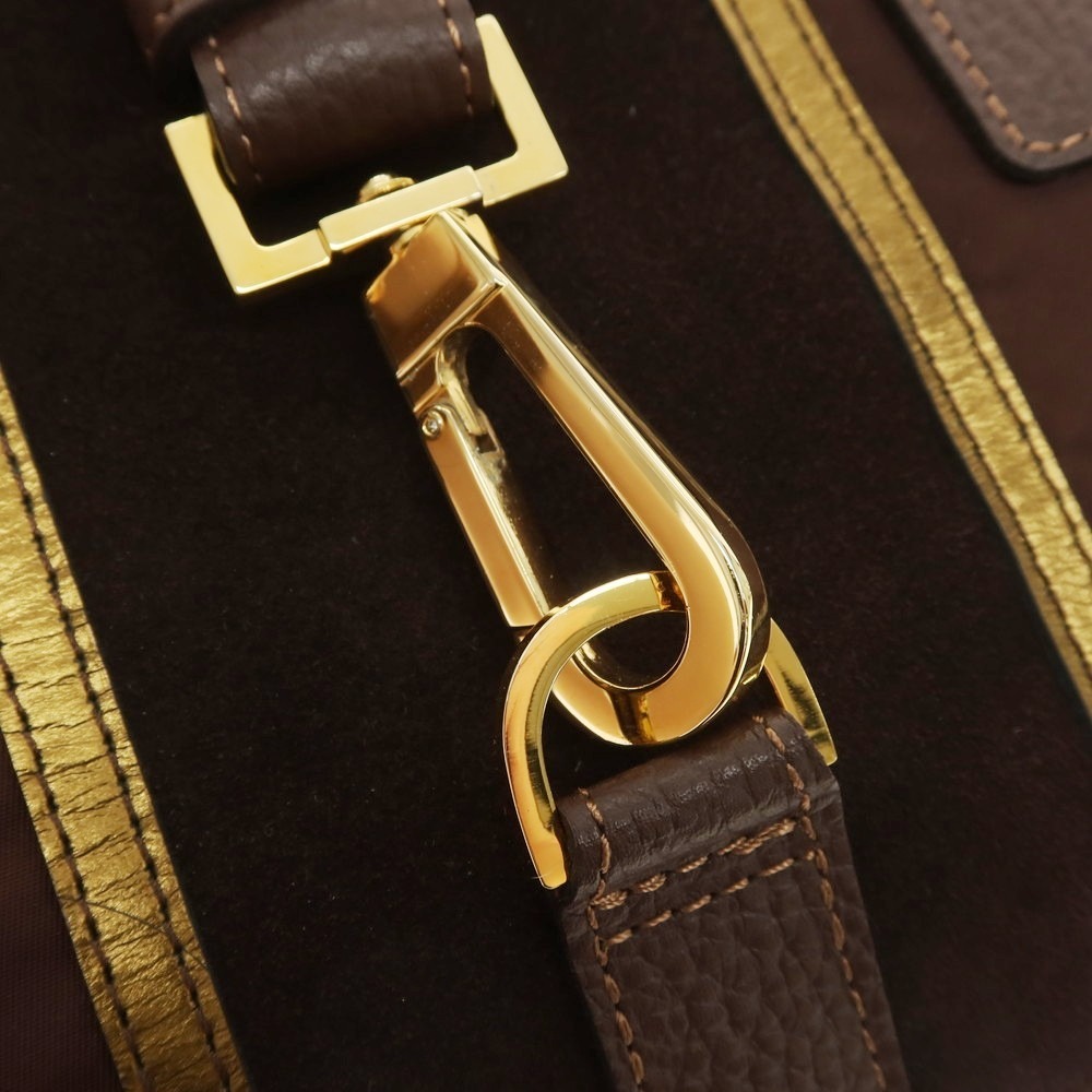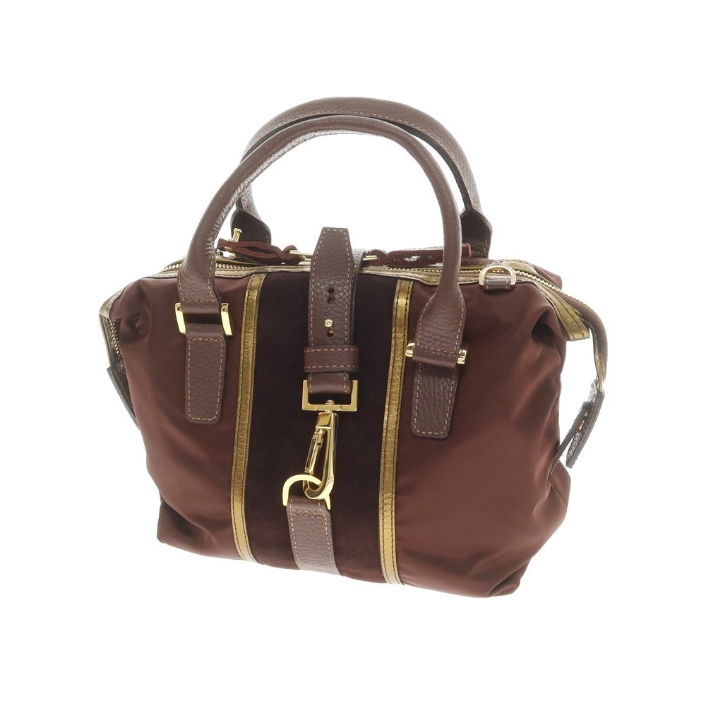 自然な光沢感があるナイロン素材を用いたハンドバッグです。小ぶりながらしっかりとマチを設け、軽くて使い勝手の良いバッグになっています。上質な素材使いはもちろん、一糸乱れぬきれいなステッチワークや艶やかな金属パーツが、高級感を感じさせます。ゴールドのトリミングやスエードの切り替えによって、シンプルでありながら存在感のあるデザインに仕上がっています。