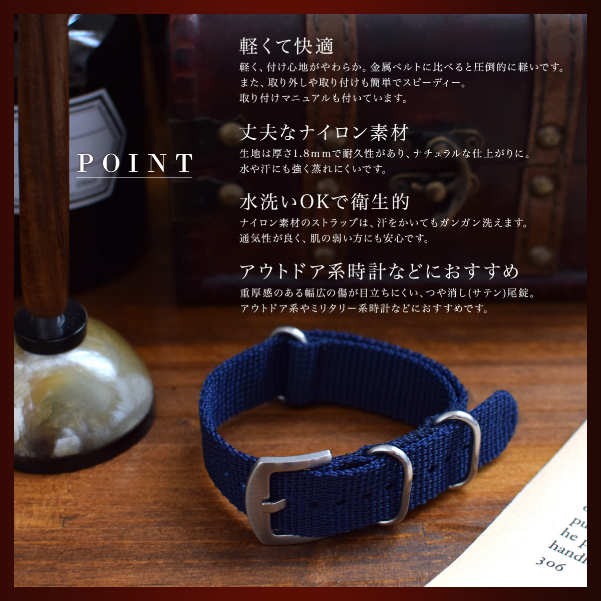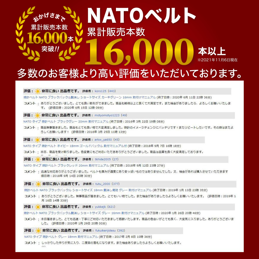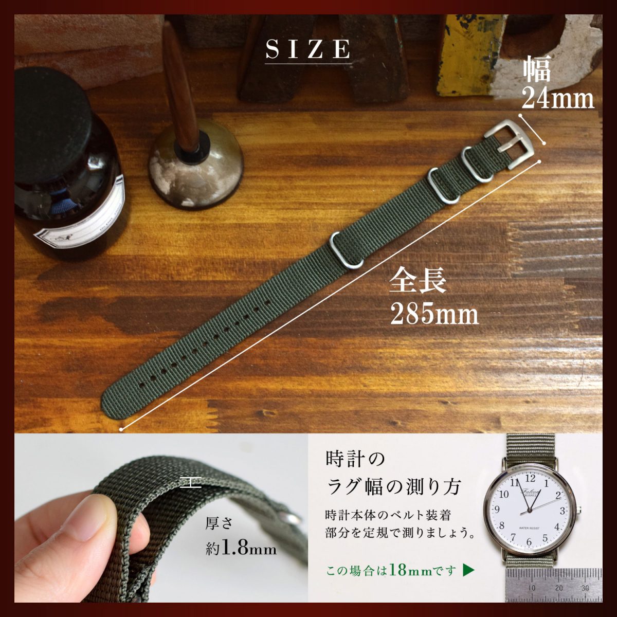| 商品説明 | ご覧頂きありがとうございます! ■サイズ■ 幅24mm(+-0.5mm)/長さ285mm(+-5mm) 厚さ1.8mm (腕時計のベルト幅・厚さを測り適切なサイズをお選びください。) ■状態■ 新品 巻く腕になじむ軟らかくしっかりした素材1.8mm厚、軽く耐久性のあるストラップです。カラーバリエーションが豊富で着用する状況によってすぐ交換でき、着せ替え感覚で洋服に合わせ楽しんでいただけます。 凡用の替えベルトですので、時計のラグ幅/厚みが合えば様々な時計に対応します。時計の雰囲気をワンランク上に引き上げてくれるベルトです。アウトドア時計 ミリタリー時計に相性が良いです。 ■特徴■ ・バックル部分にはステンレス製尾錠を採用。丁寧に磨いた光沢、サビに強いです。 ・生地は耐久性に優れたコットンナイロン素材、軽く付け心地に考慮しました。 ・水洗いがOKで衛生的。汗をかいてもガンガン洗えます。肌の弱い方にも安心です。 ・NATOタイプベルトは時計への装着が簡単で、すぐ交換出来ます。 ■注意事項■ ※当該商品は自社販売と在庫を共有しているため、 在庫更新のタイミングにより、在庫切れの場合やむをえずキャンセルさせていただく可能性があります。 ※ご利用のモニタ環境によって掲載写真と実際の商品の色味が異なる場合がございます。 ※入荷時期により細部、特に長さに変更がある可能性がございます。 ※内容品はベルトと取付マニュアルです。その他の附属品はありません。 *商品に重大な欠陥があった場合、到着から7日以内に連絡頂ければ返品に応じます。 *ご落札から一週間以内のご連絡が頂けませんでしたら、理由を問わず取り消させて頂きます。 ■発送方法■ 出品者の負担で発送致します。 ■全国一律無料 *発送後に追跡番号をお知らせします。 *梱包材料&梱包手数料はいただいておりません(無料) *クッション封筒を使用して丁寧に梱包し発送いたします。 *送料過不足による、差額請求ならびに返金は致しませんのでご了承下さい。 *ご入金のご連絡から早くて当日、遅くとも二日以内には発送させて頂きます |
