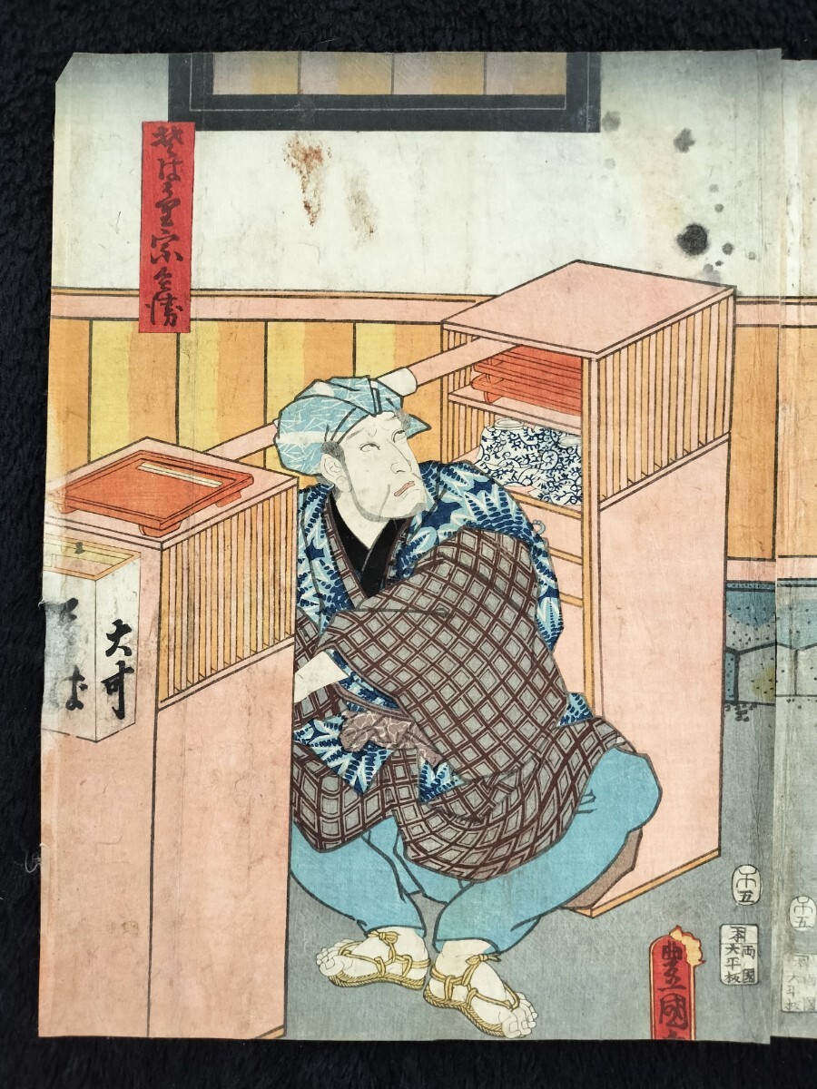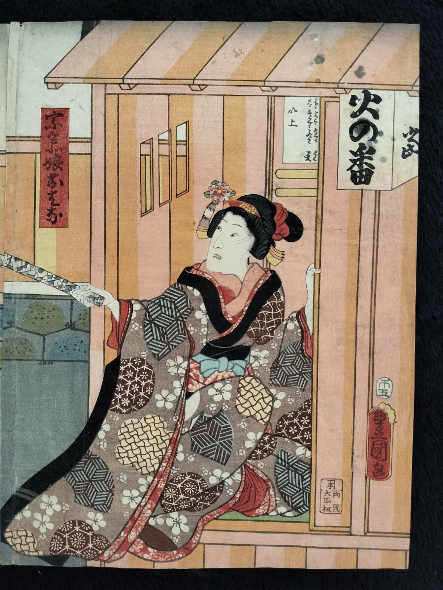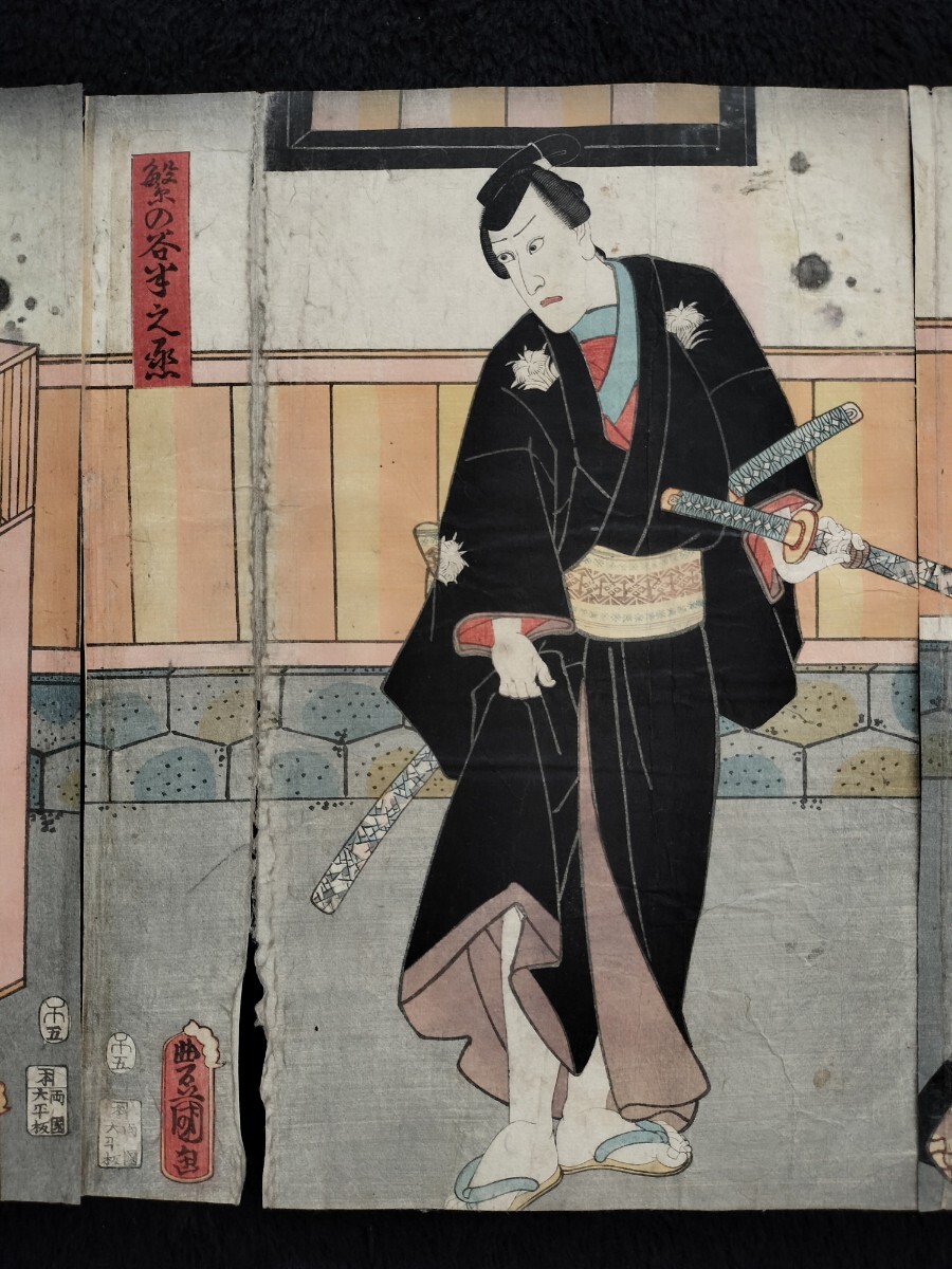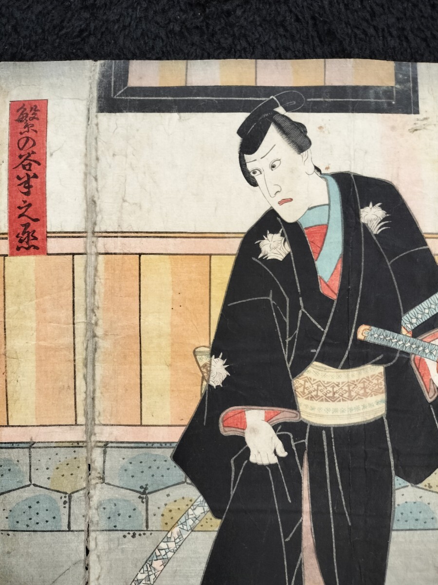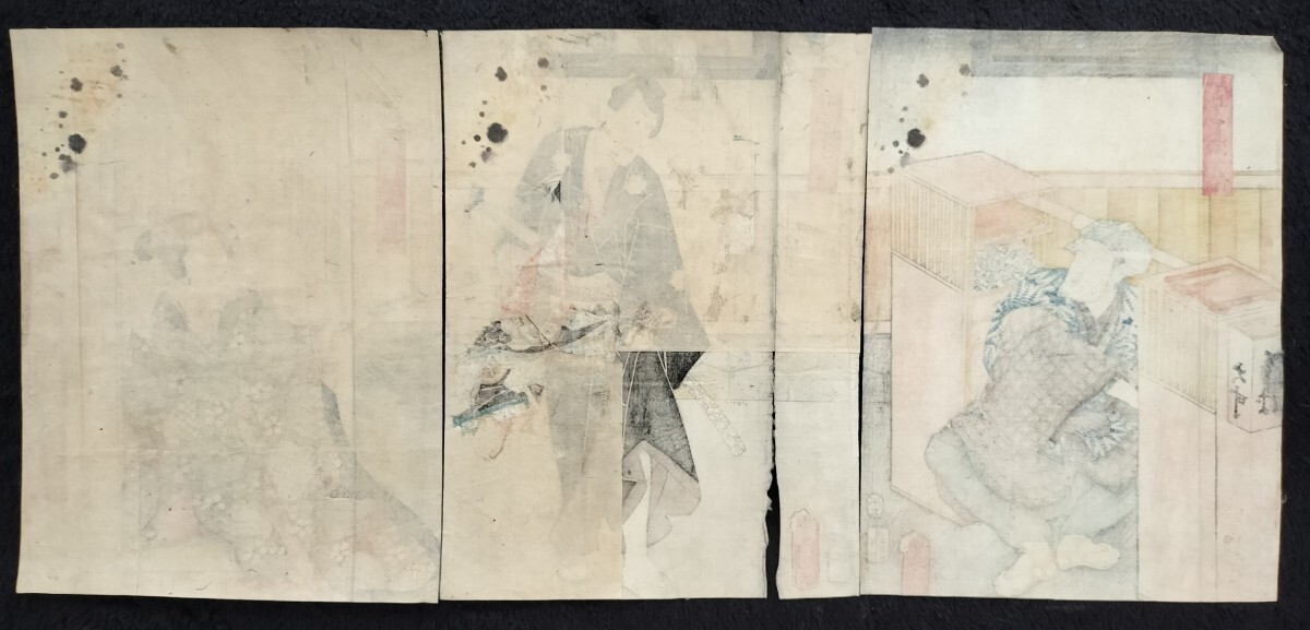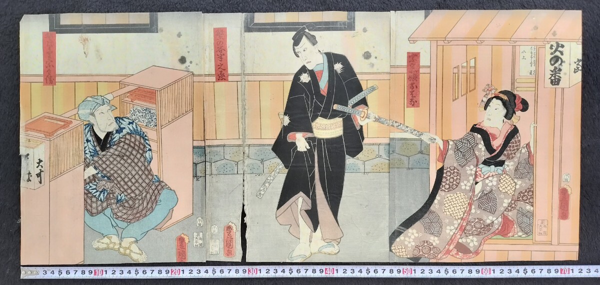 江戸期/真作 歌川豊国「仮名手本硯高島」本物浮世絵木版画 歌舞伎絵 役者絵 芝居絵 錦絵 大判 三枚続き 裏打ち