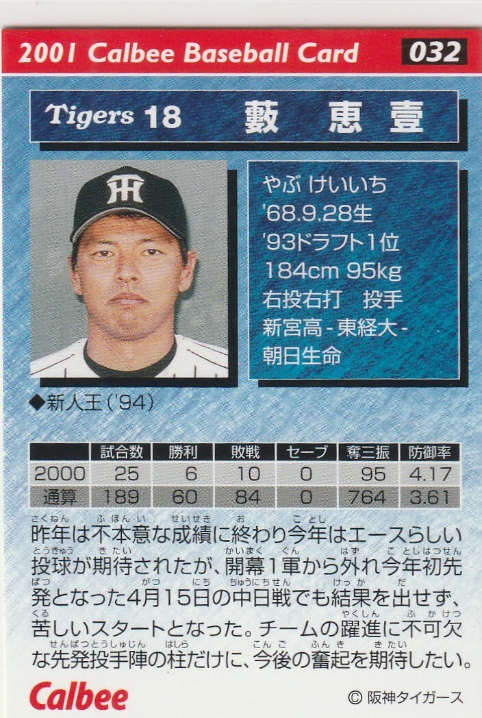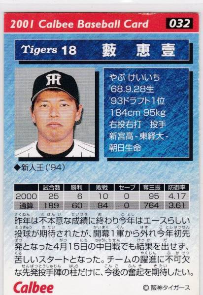 ●2001カルビー 【藪 恵壹】 BASEBALL CARD No.032:阪神 R2