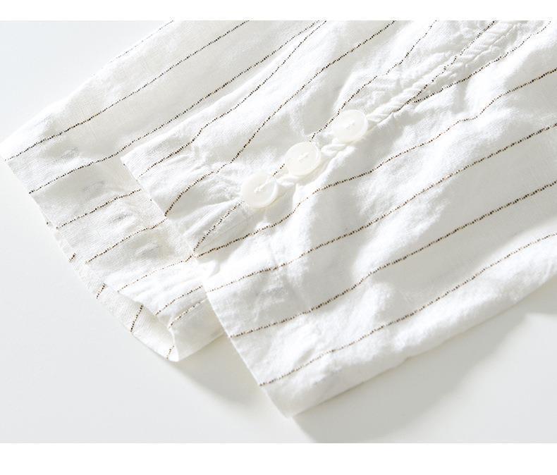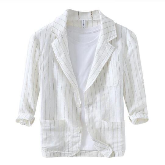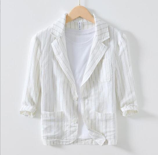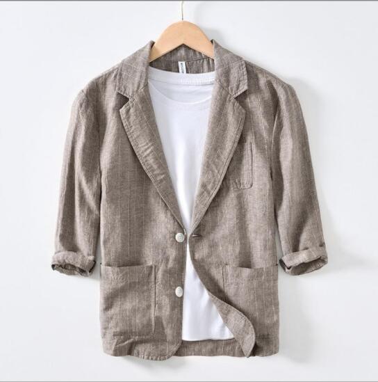 新入荷2XL上質コーヒー新品リネンコットン 七分袖 テーラードジャケット ピンストライプ メンズ 春夏 サマー 麻綿 アンコン ブレザー 背抜