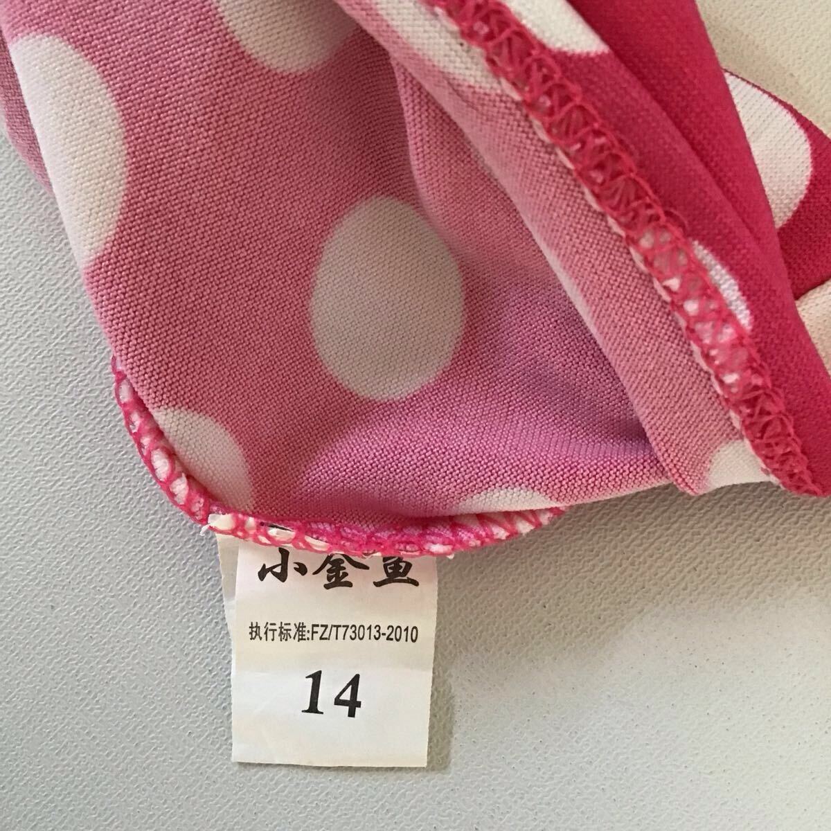 サイズは14サイズ です。調べたところ140cm〜150cmにあたるようなのですが、念の為、130cm を着れるお子様の着用を、お勧めします。