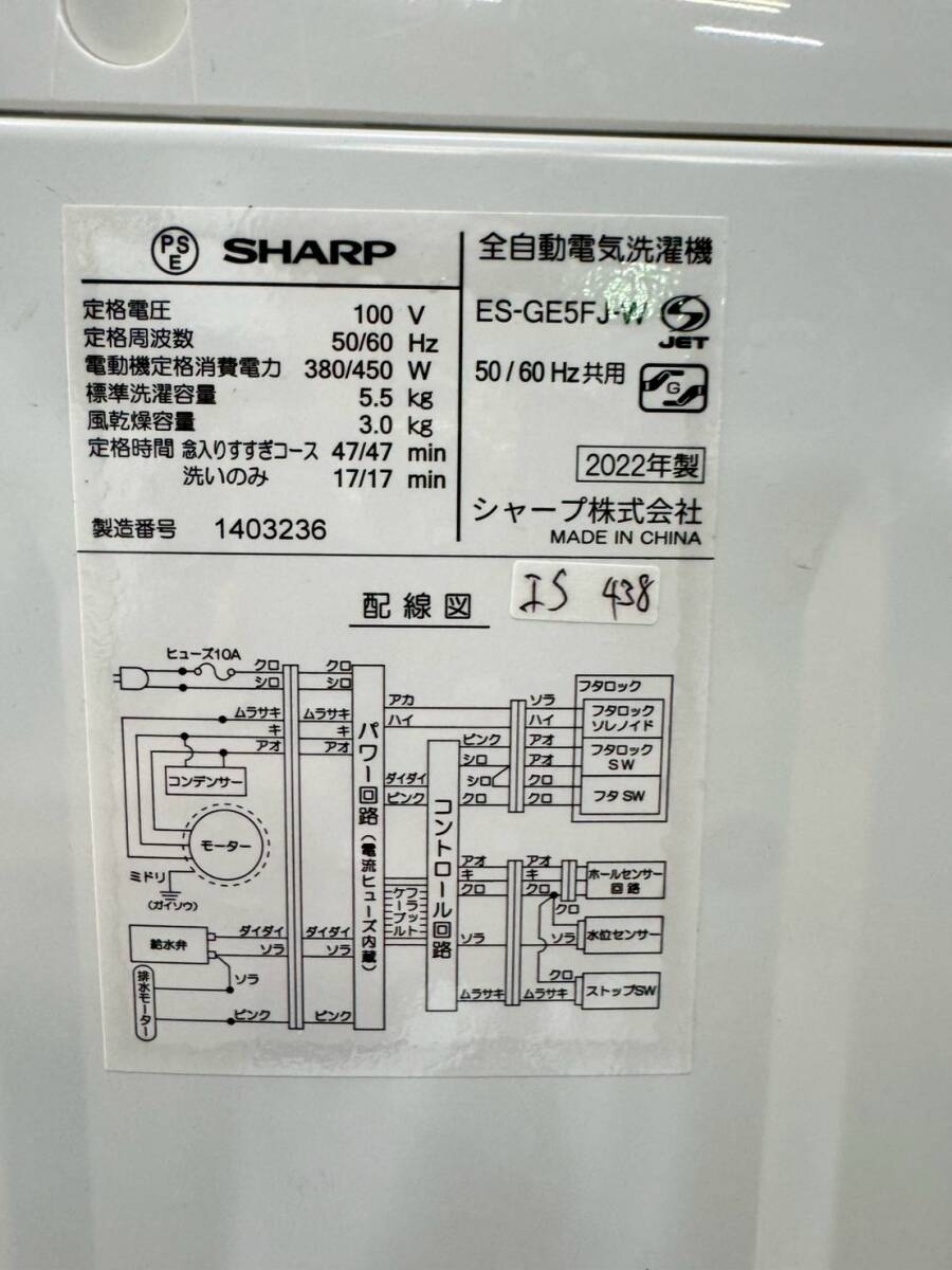 【美品】大阪送料無料★3か月保障付き★洗濯機★シャープ★5.5kg★2022年★ES-GE5FJ-W★IS-438