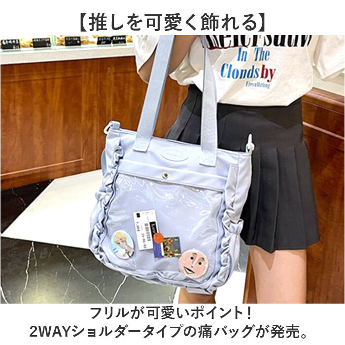 商品説明 | ・・【推しを可愛く飾れる】 ・フリルが可愛いポイント!2WAYショルダータイプの痛バッグが発売。 ・【クリア窓で推しをアピール】 ・大きなクリア窓付きでぬいぐるみバッジやアクリルスタンドを入れるのに最適☆ ・【女の子らしいフリル付き】 ・バッグのフチには可愛いフリルを付けて女の子らしさもUP♪推しを可愛く飾れるのもGOOD ・【マストなアイテムをIN】 ・お財布や500mlサイズのペットボトル、手帳などマストなアイテムが入るサイズ☆ ・【サッと取り出せるポケット】 ・両サイドと背面にアウトポケットを設け、すぐに取り出したいアイテムをIN。 ・【ライブ等で活躍する2WAY】 ・付替えOKのショルダー紐つき!イベントやライブで、ハンズフリーで動けるのが嬉しい♪ ・【肩掛けもできるハンドル】 ・ハンドルは長めの設計で肩掛けができる作りで持ち運びがしやすい◎ ・【推しへの愛がもっと伝わるバッグ】 ・ライブやイベントにぴったり。好きな気持ちをさりげなくアピールアイテム。 ・【ポケット仕様】 ・メインルーム・・・オープンポケット×2 ・フロント・・・クリア窓付きポケット×1 ・背面・・・ファスナーポケット×1 ・両サイド・・・オープンポケット×1ずつ |