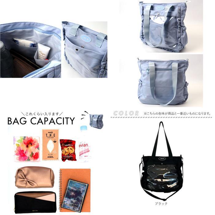 サイズ | [縦]約28cm/[横(底部)]約27cm/[マチ]約9.5cm [持ち手]約58cm/[ショルダー]約69cm~約124cm(調節可能) 【クリア部分】 [縦]約19.5cm/[横]約24cm ※サイズは当店計測の実寸サイズです。実際の商品ならびにメーカー表記サイズとは多少の誤差が生じる場合がございます。あらかじめご了承ください。 |