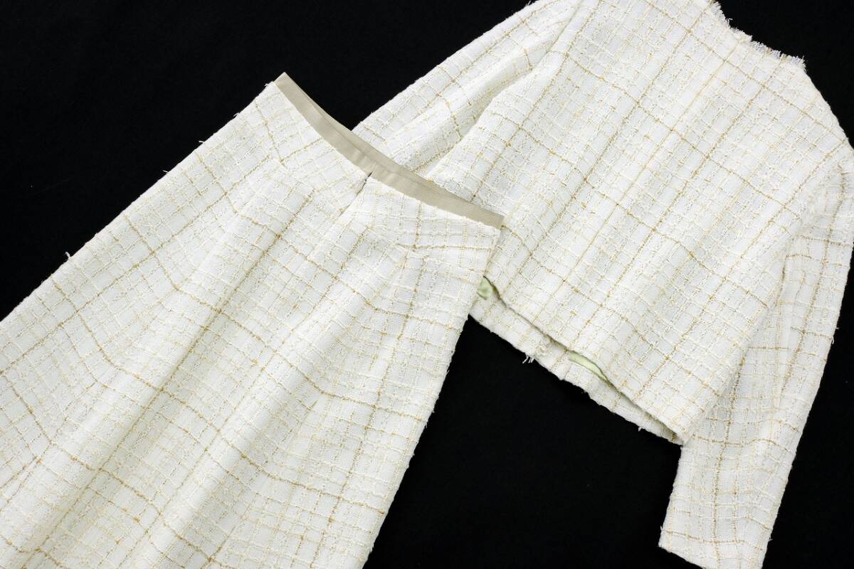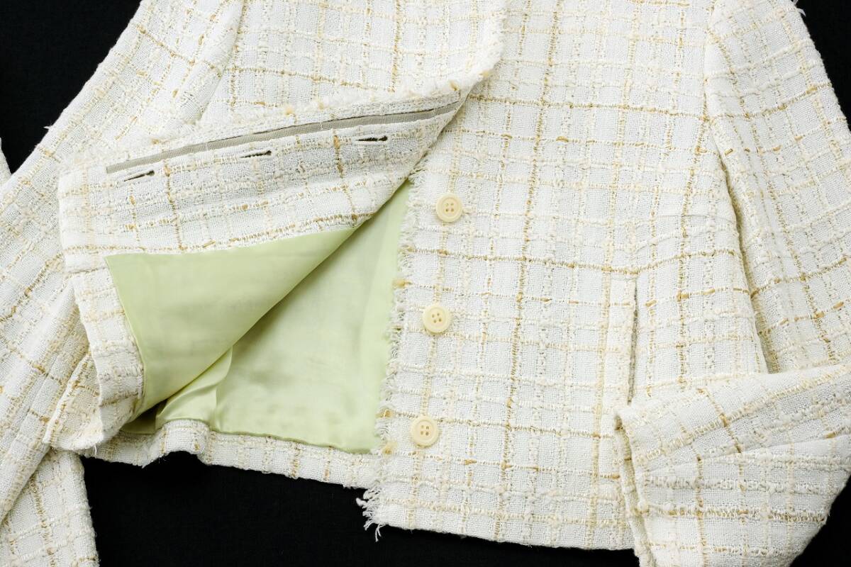 繊細なラメが煌めくサマーファンシーツイードを使用した、シャネルライクなセットアップ。