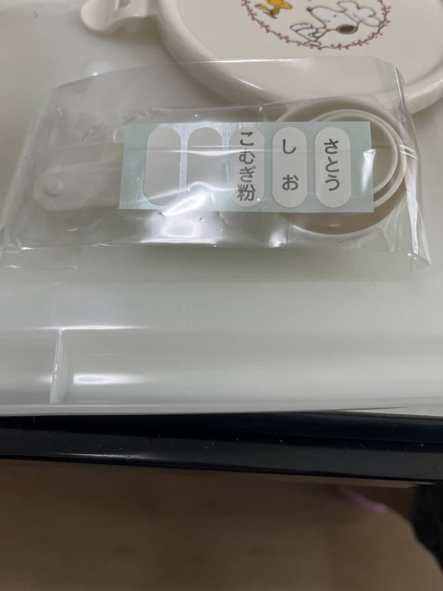 スヌーピのケースです。調味料を入れた時に使う大さじ、小さじなどのスプーンもついています。しっかりとしたケースです。