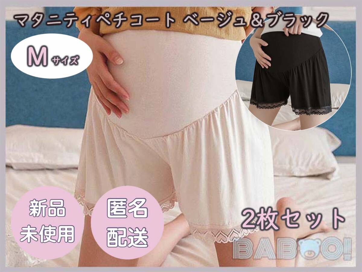 マタニティ ペチコート レギンスパンツ スパッツ ショート丈 韓国風 Mサイズ 2枚セット ブラック×ベージュ 産前 産後 薄手 ウエストゴム