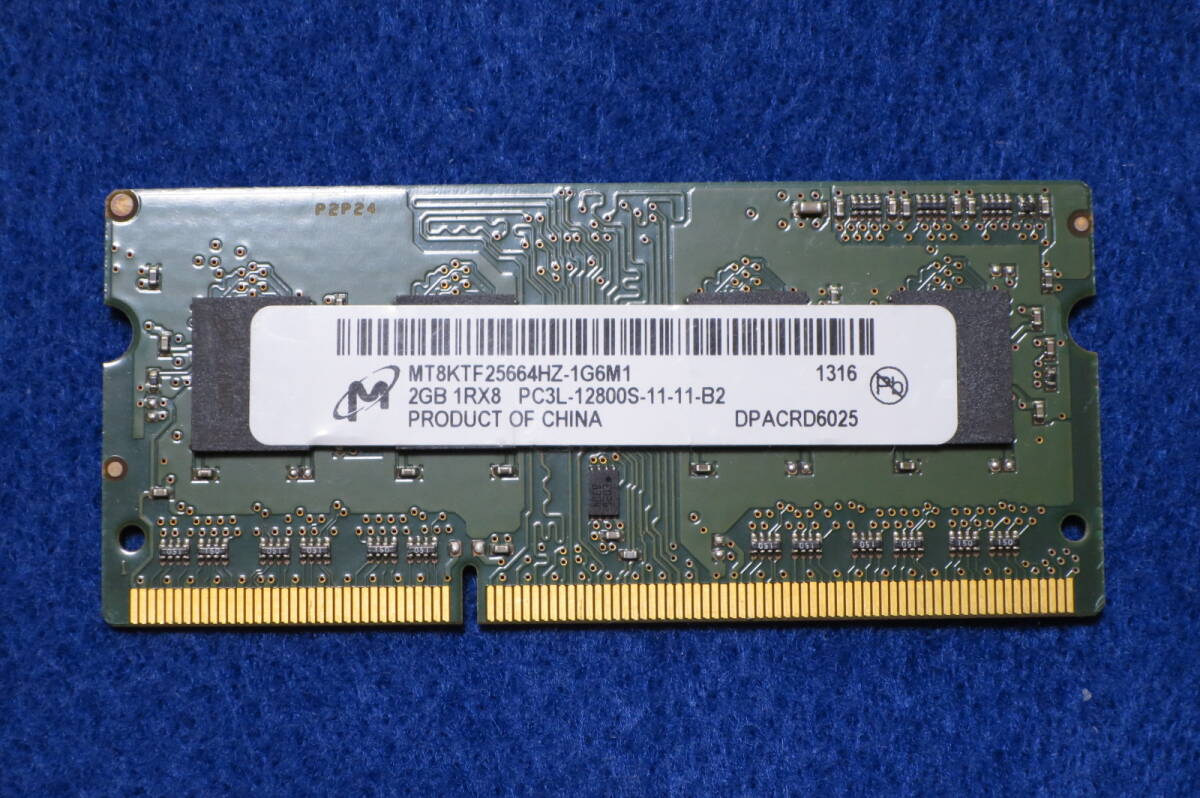 ノートパソコン用の内蔵メモリ、Micron 2GB PC3L-12800S-11-11-B2 低電圧版の中古品です。