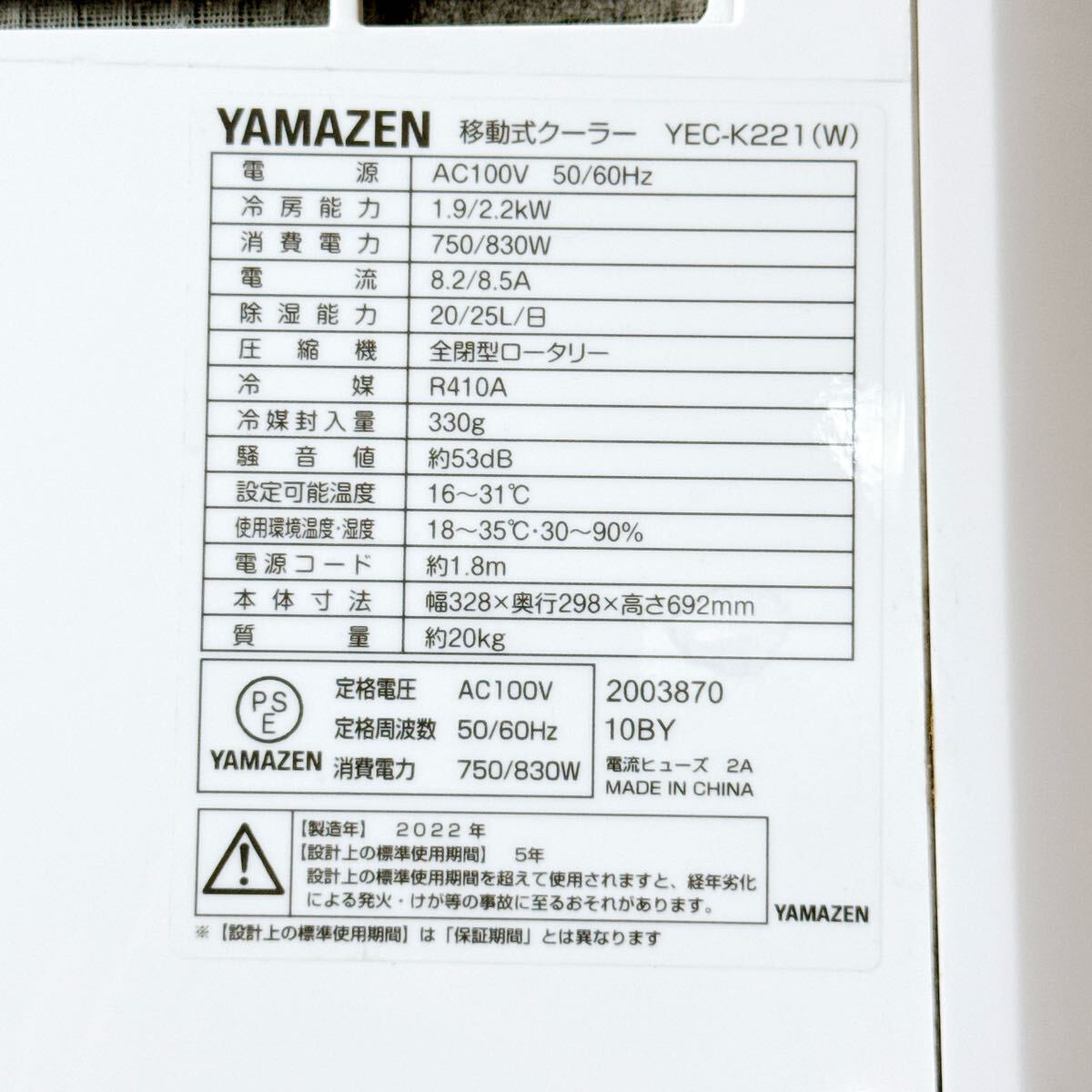 210*中古 YAMAZEN 山善 スポットクーラー 移動式クーラー YEC-K221(W) ホワイト 2022年製 動作確認済み*