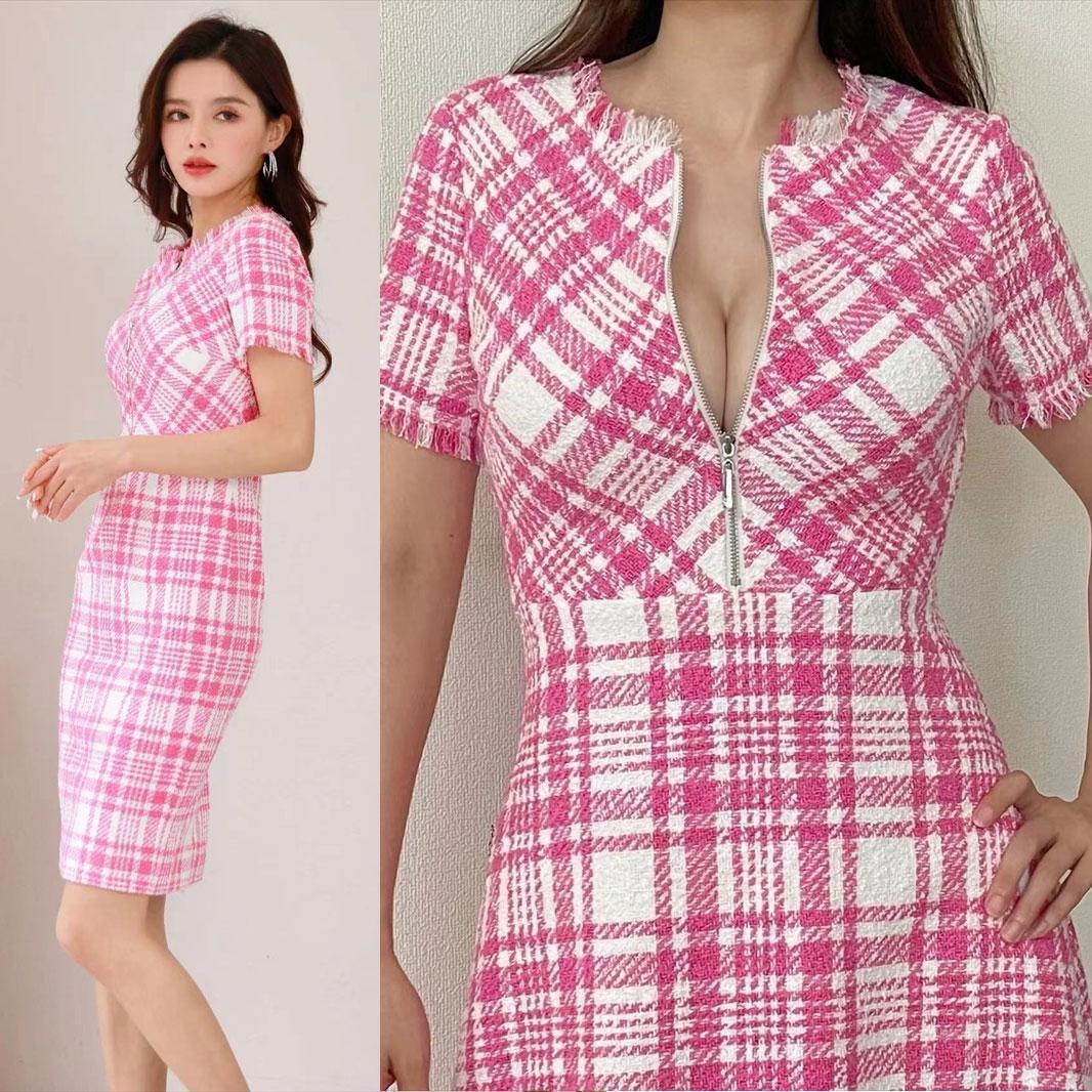 ツイード/ 半袖/ 袖あり/ フロントジップ/ タイト/ ワンピース/ ミニドレス/ キャバドレス